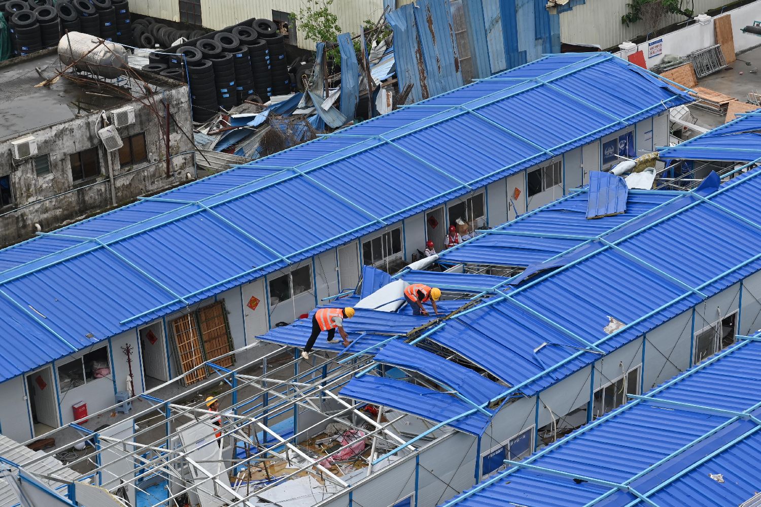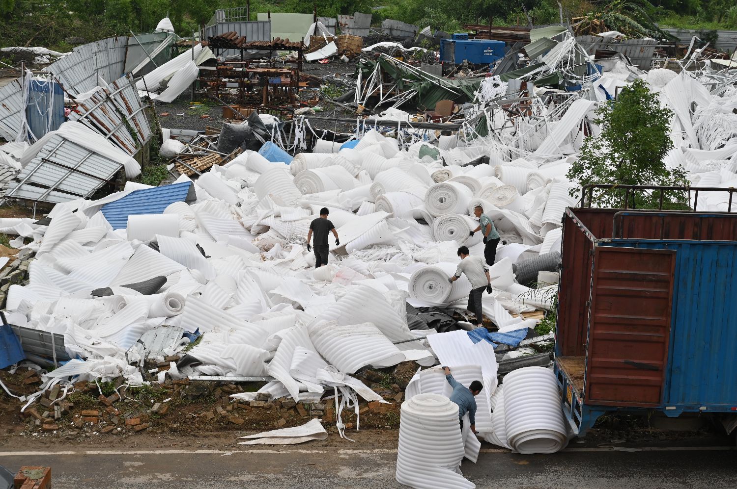 4月29日,工作人员在金盆村清理屋顶的铁皮。