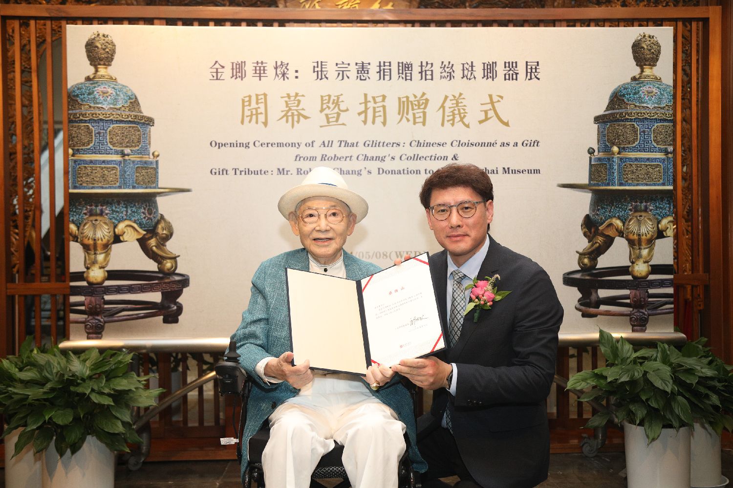 5月8日,“金琅华灿:张宗宪捐赠掐丝珐琅器展”开幕暨捐赠仪式在上海博物馆举行。自2023年起,中国艺术品收藏家张宗宪共向上海博物馆捐赠了55件铜胎掐丝珐琅器珍品,其中不乏清康熙、乾隆时期造办处作品。图为上海博物馆馆长褚晓波向张宗宪(左)颁发捐赠证书。(图片来源:本文图片均自中新社)