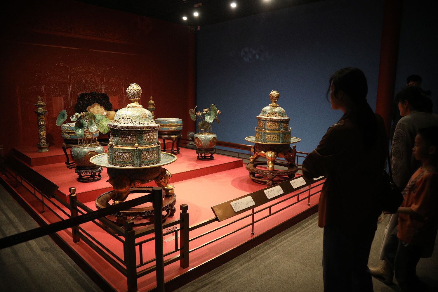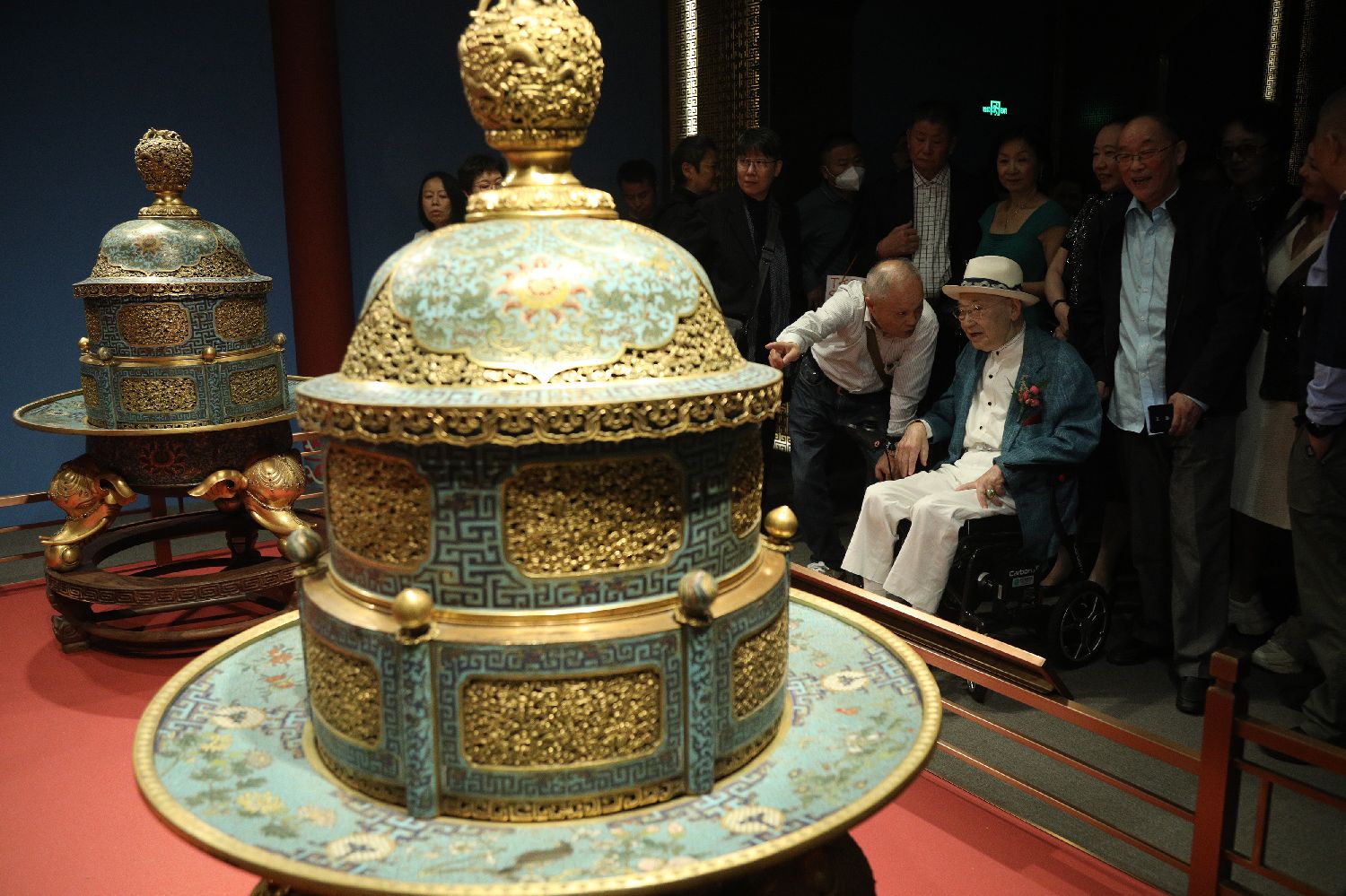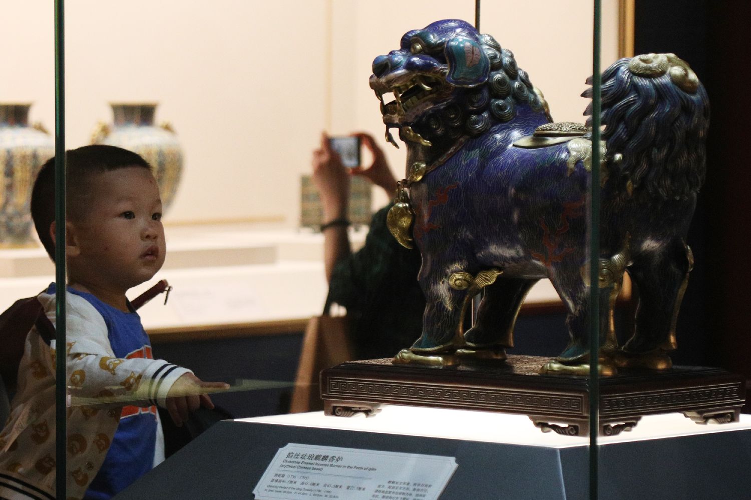 图为观众欣赏掐丝珐琅麒麟香炉。