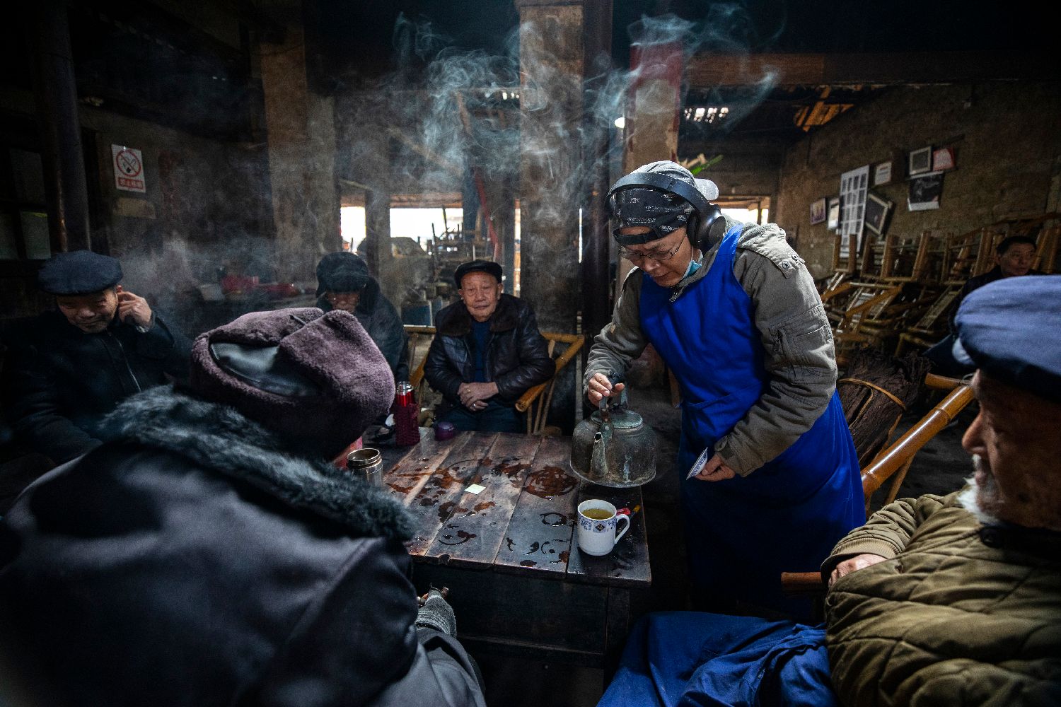 在成都市双流区彭镇观音阁老茶馆,老板为茶客们添水(2021年11月23日摄)。