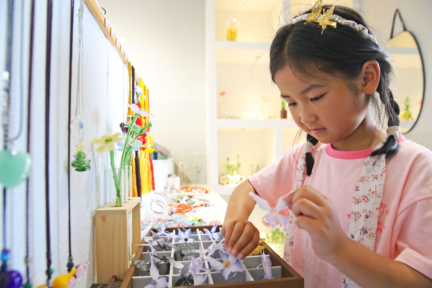 5月9日,在淄博市博山区颜神古镇的“石榴王”手造琉璃坊,一名小朋友挑选琉璃首饰。(图片来源:本文图片均据新华社)