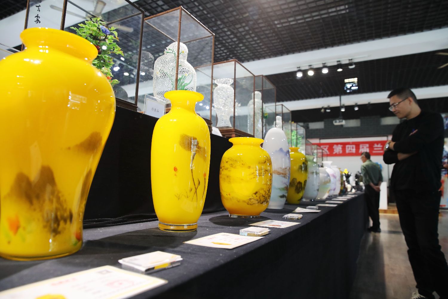 5月9日,在淄博市博山区的西冶工坊,参观者挑选琉璃产品。