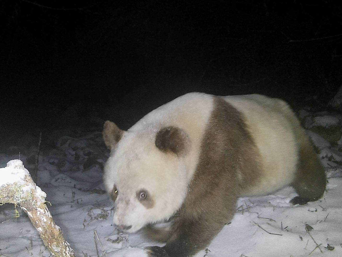 1月17日,红外相机距离捕捉到一只健康成年棕色大熊猫在雪地中悠闲踱步的身影。(图片来源:中新社)