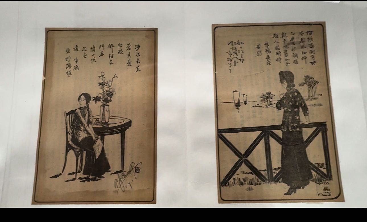 记者在现场看到一组《民国日报》(上海版)刊载张大千“啼鹃”款人物画。上海静安大风堂美术馆策展人李梦园告知,张大千早年曾在作品中署名“啼鹃”,并在《民国日报》(上海版)上发表,这些作品于1917年4月1日(总第28号)至8月25日(总第174号)刊载在“投稿画、美术画”栏目中,共发表有张大千创作的18幅时尚人物画。
