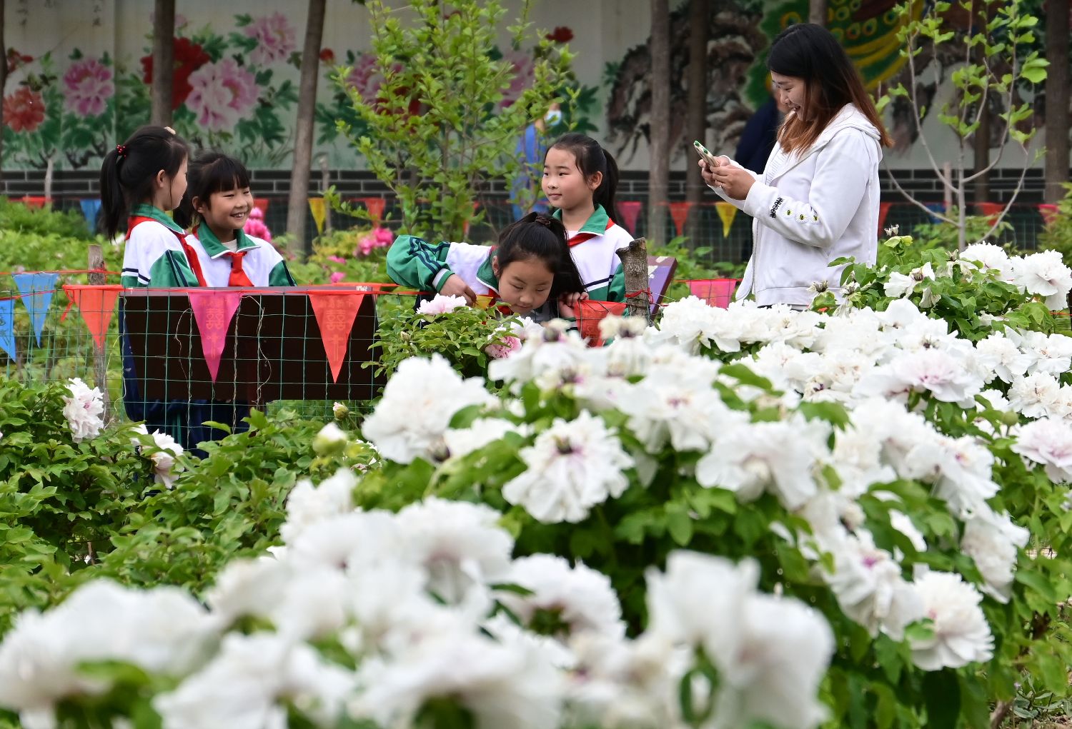 4月29日,河北省衡水市阜城县小学师生在刘老人村欣赏牡丹花。(图片来源:中新社)