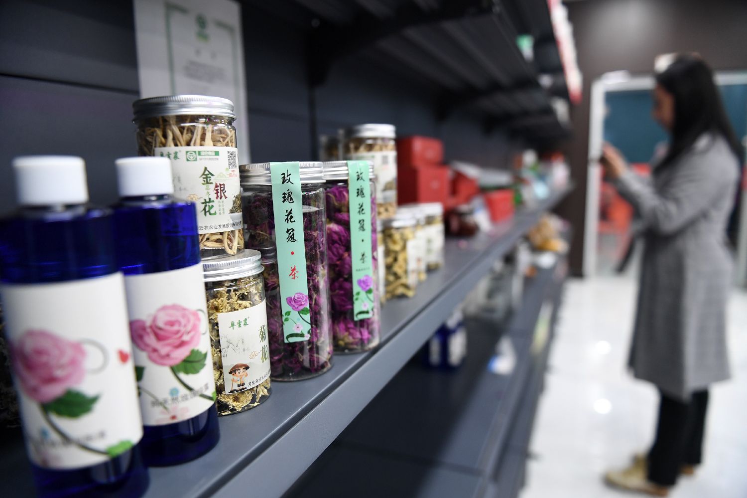 4月29日,游客在阜城县王集乡河北阜云农农业发展股份有限公司选购玫瑰花系列产品。(图片来源:中新社)