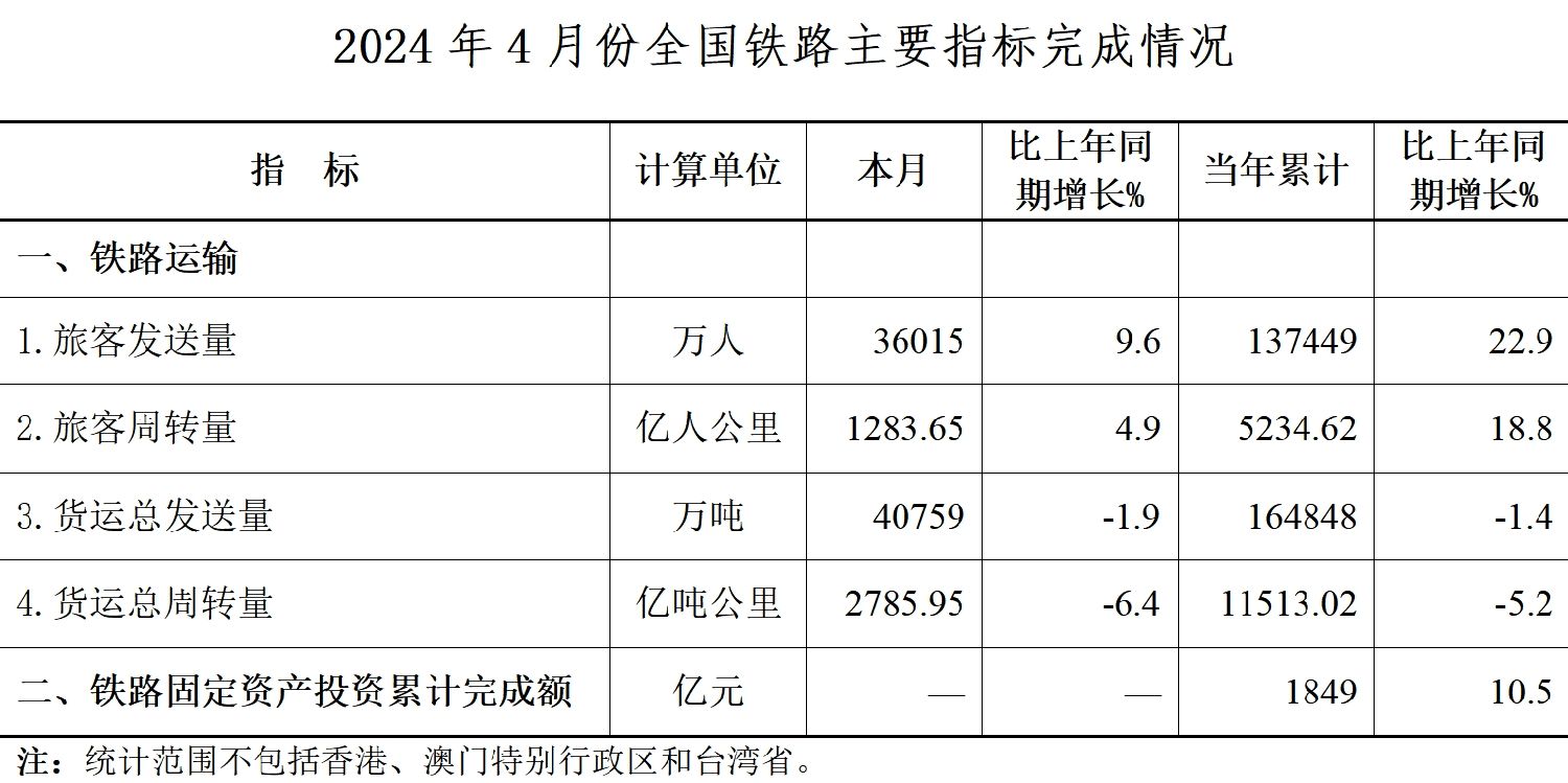 中国国家铁路局14日在官网公布2024年4月份全国铁路主要指标完成情况。数据显示,4月,全国铁路旅客发送量36015万人,同比增长9.6%;铁路固定资产投资累计完成1849亿元,同比增长10.5%。