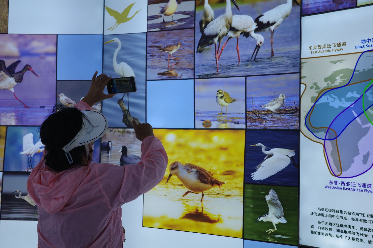 条子泥湿地是世界第八大候鸟迁徙路线东亚—澳大利西亚候鸟迁徙路线的关键区域,每年约有300万只候鸟在这里停歇、繁殖和越冬,是名副其实的“鸟类天堂”。图为游客在条子泥湿地景区展示馆参观。