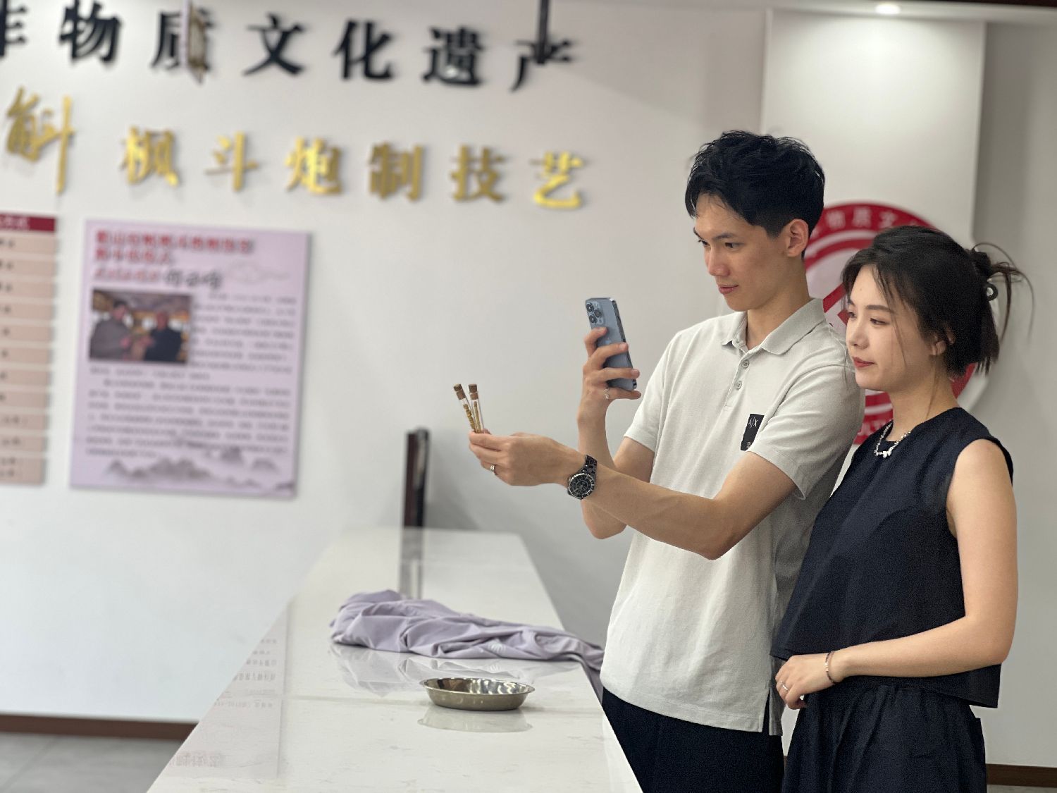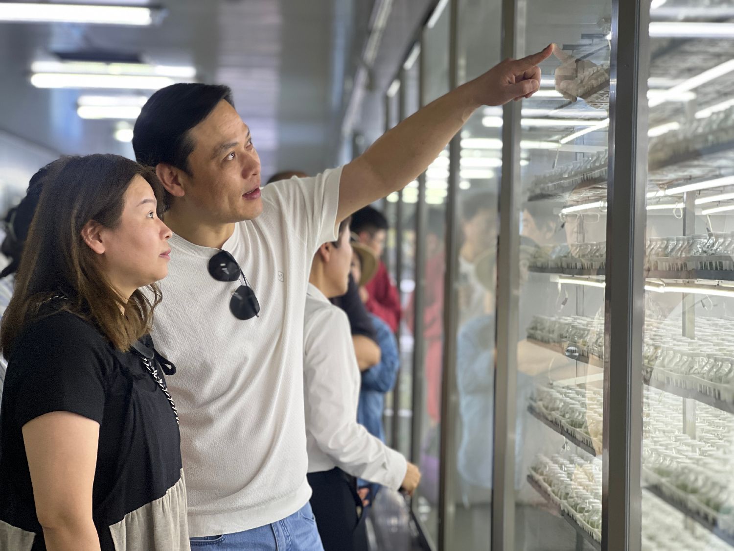 5月23日,台商魏盼盼(左)和丈夫王龙一起参观九仙尊石斛文博园。(图片来源:中新社)