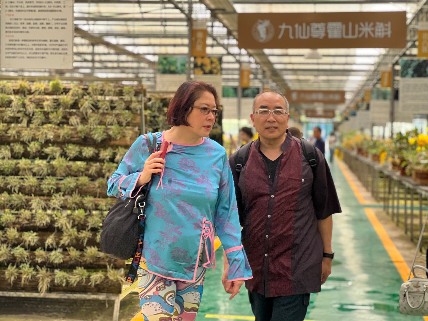 5月23日,台青答允煦(左)和妻子徐晶晶一起参观参观九仙尊石斛文博园。(图片来源:中新社)