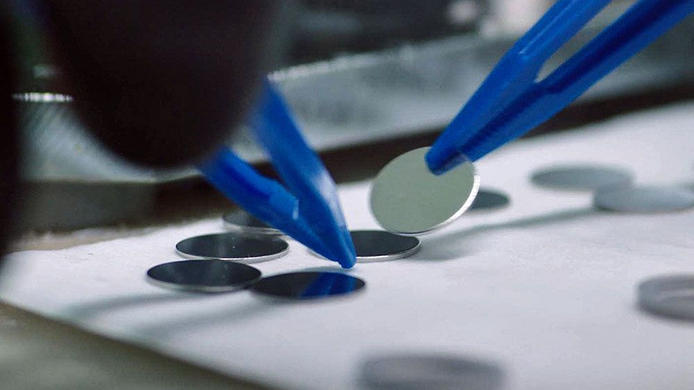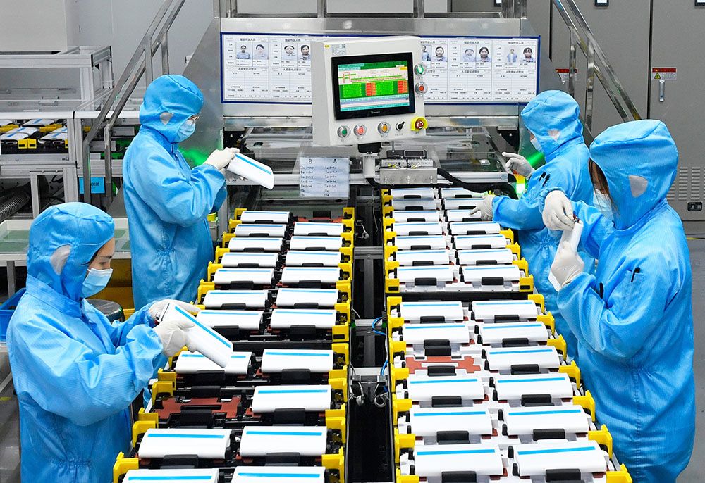 在广西柳州市瑞浦赛克动力电池有限公司电芯装配车间,工人进行目检工序。