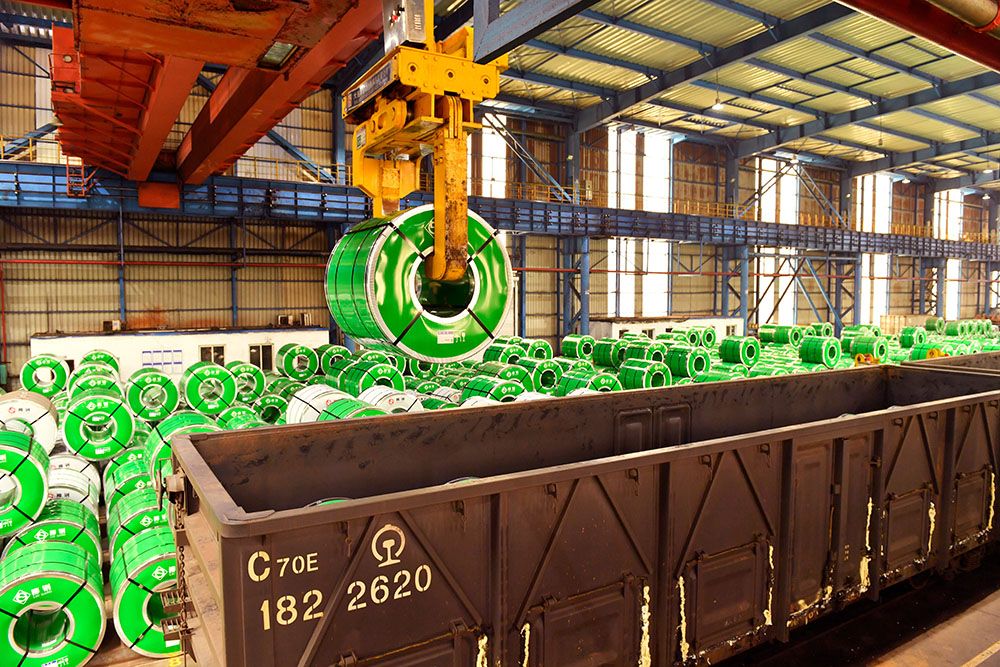 在广西柳州市柳钢集团冷轧成品库房,起重机吊运成品钢卷至火车上。