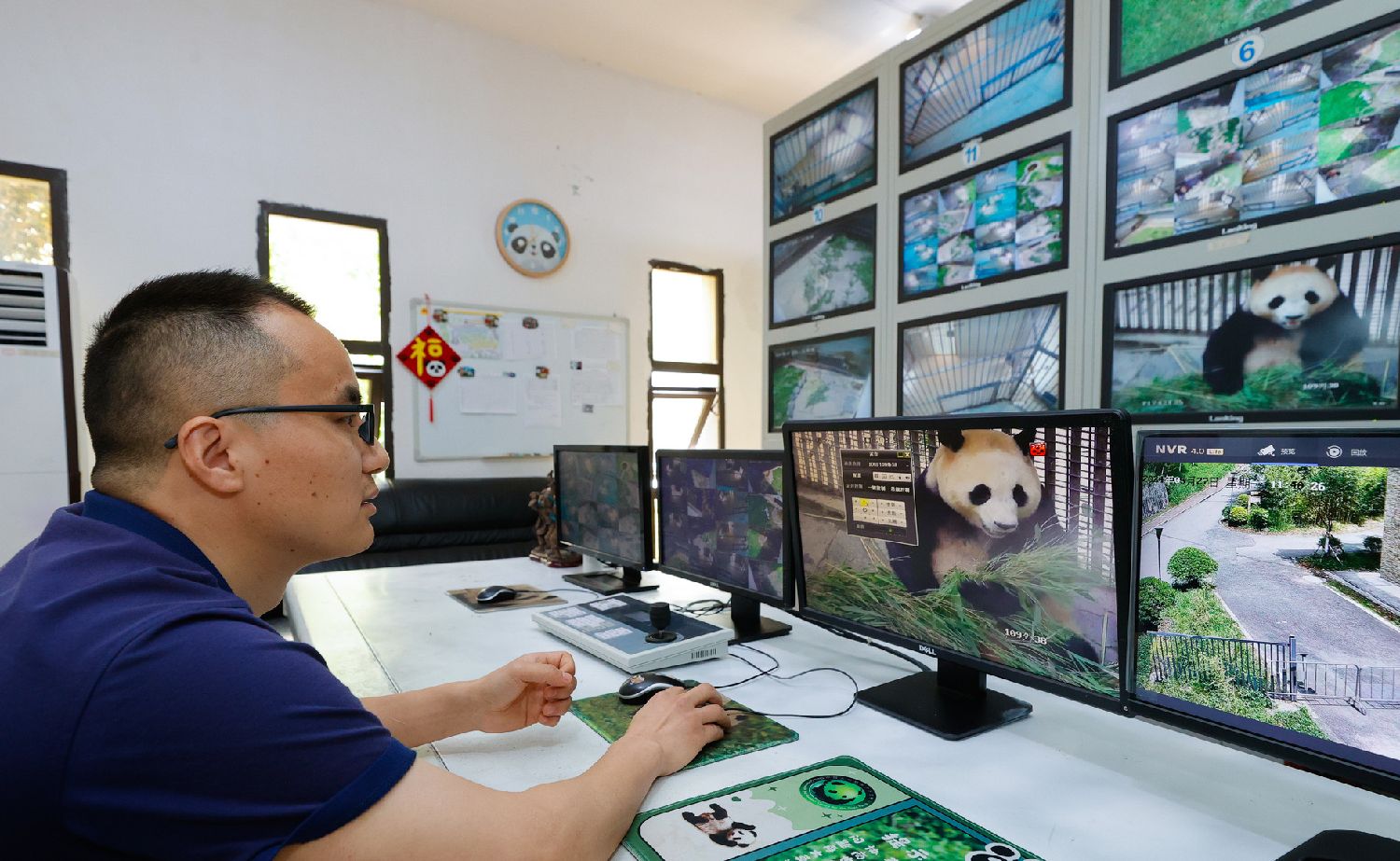5月27日,在中国大熊猫保护研究中心卧龙神树坪基地的监控室,大熊猫“福宝”的饲养员徐翔通过监控观察“福宝”吃竹子的情况。