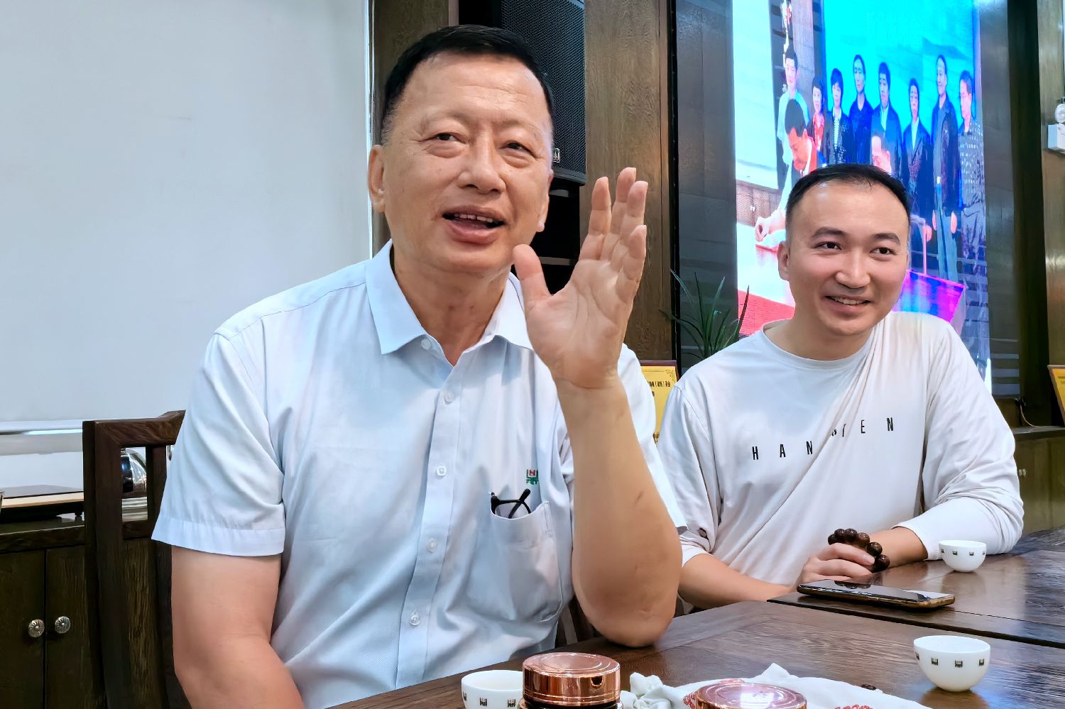 5月23日,台农、福建省龙岩市漳平台商联谊会会长李志鸿(左)分享“登陆”创业故事。(图片来源:中新社)
