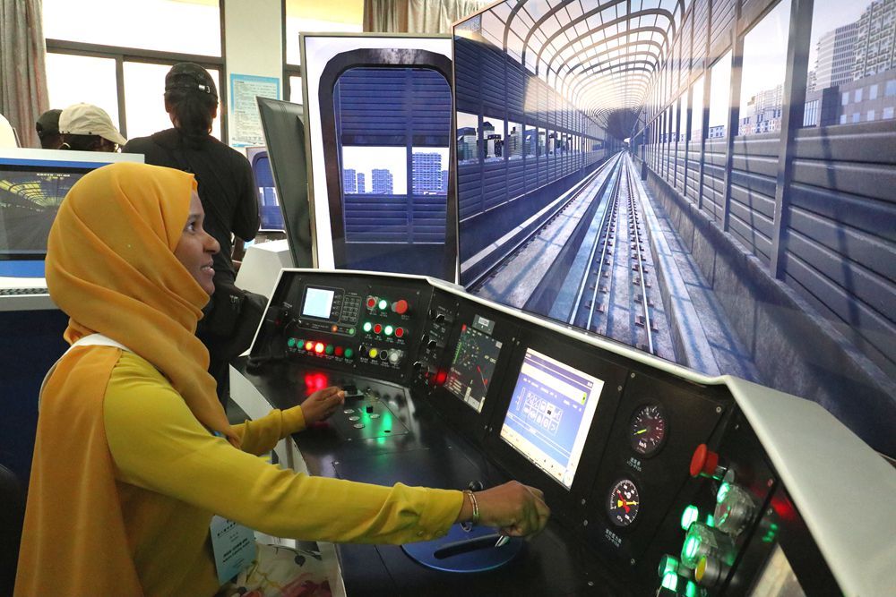 5月23日,在浙江师范大学工学院实验室,非洲青年代表体验城轨车辆模拟驾驶。(图片来源:本文图片均来自中新社)