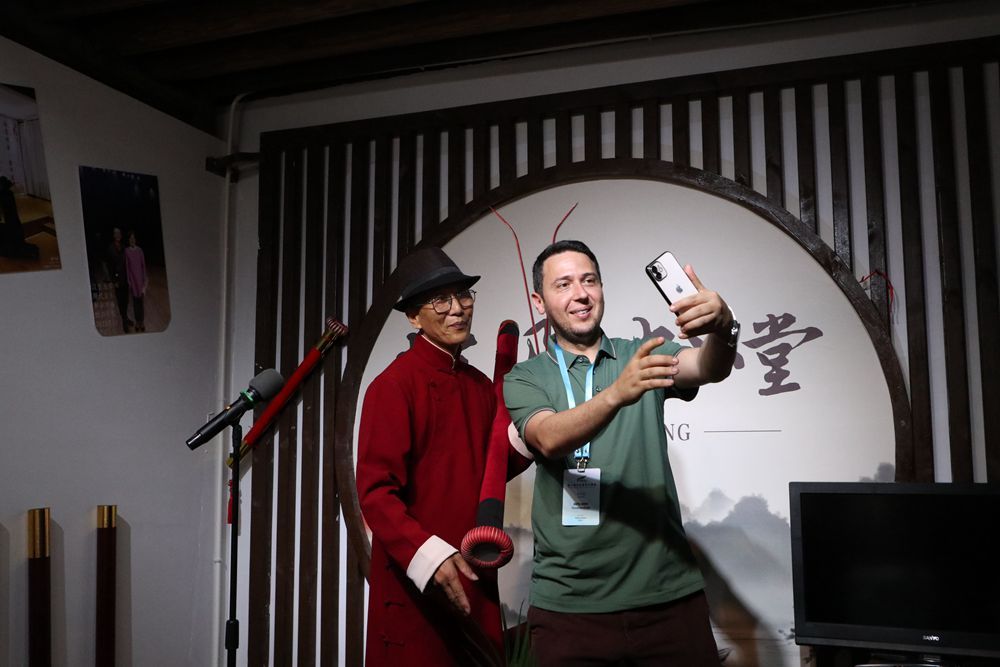 5月23日,在浙江金华坡阳古街,突尼斯青年吴俊和金华道情艺人合影。