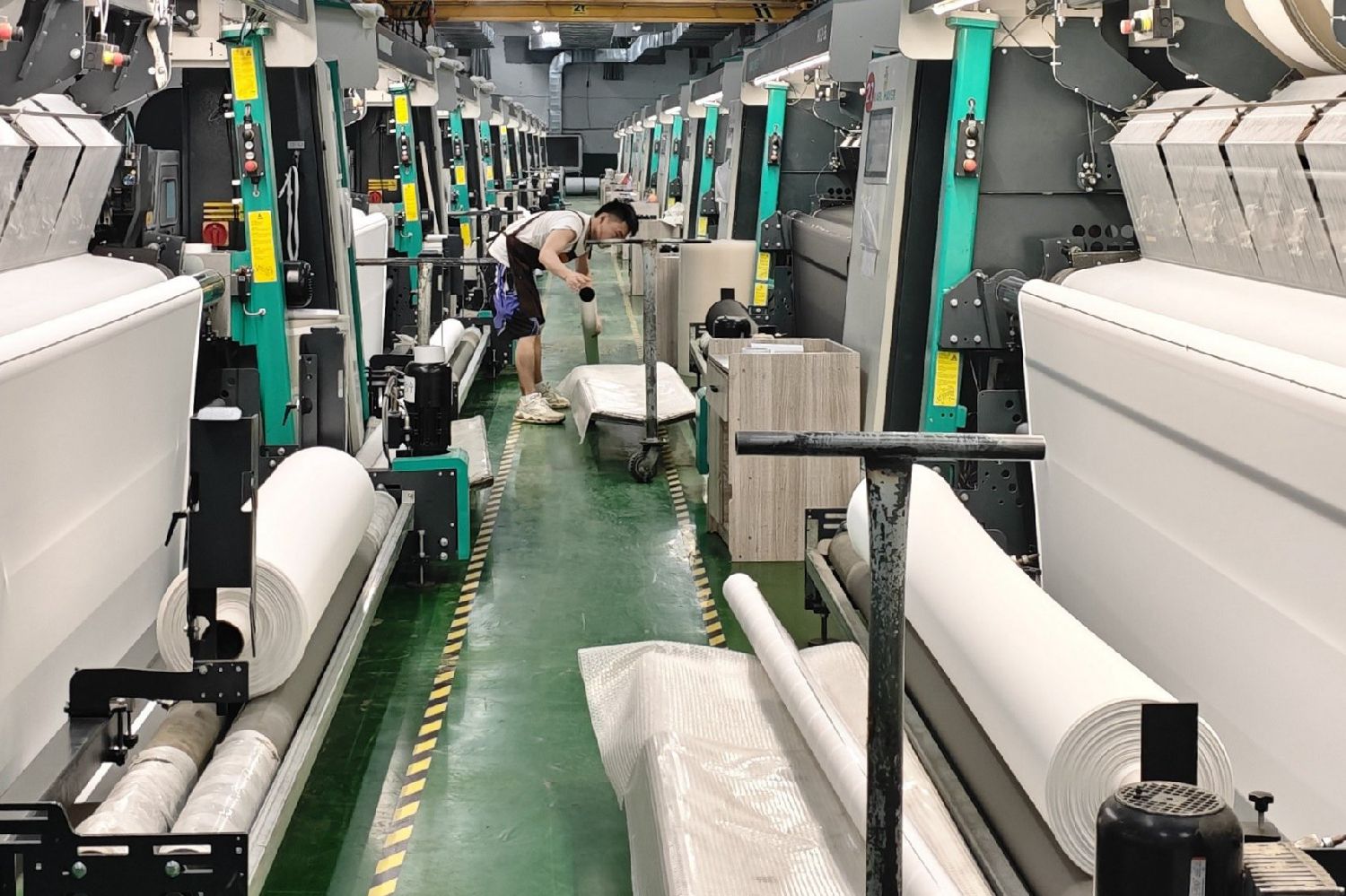 5月27日,晋江市七彩狐服装织造有限公司的自动化生产线正快速运转。(图片来源:中新社)