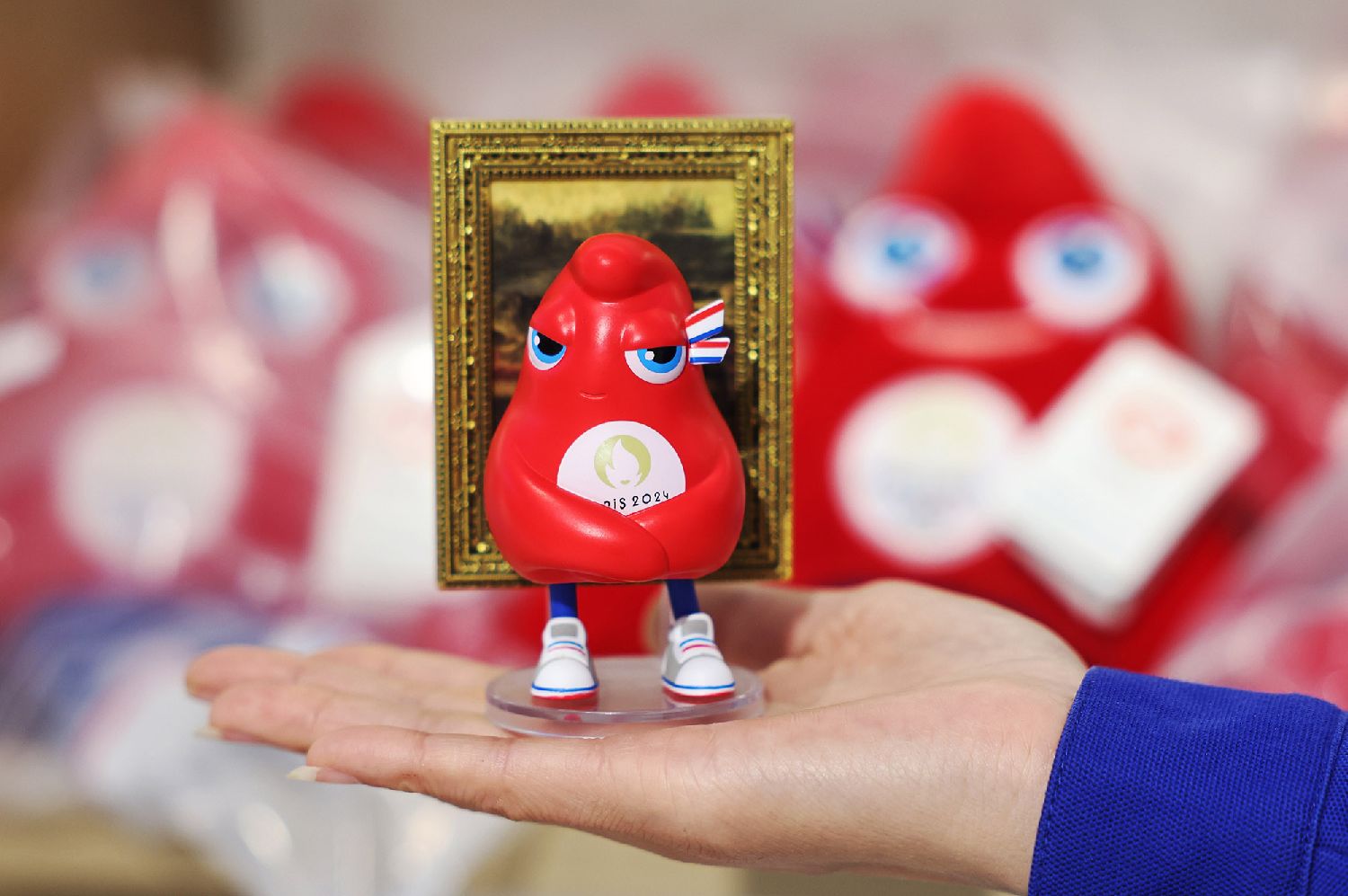 5月30日,销售人员展示巴黎2024奥运会吉祥物摆件“蒙娜丽莎”款。
