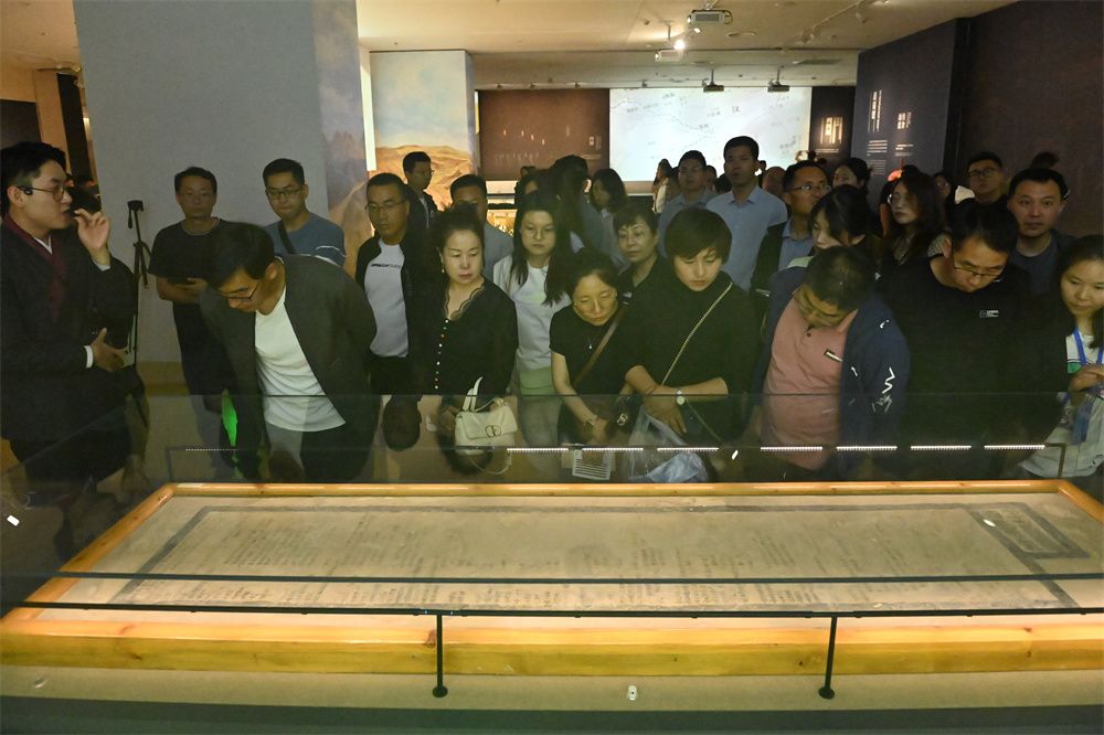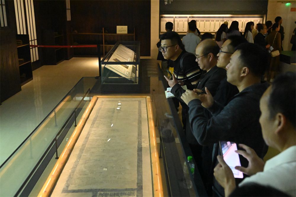 5月29日,观众在甘肃简牍博物馆参观中国国宝级文物《四时月令诏条》墙壁题记。(图片来源:中新社)