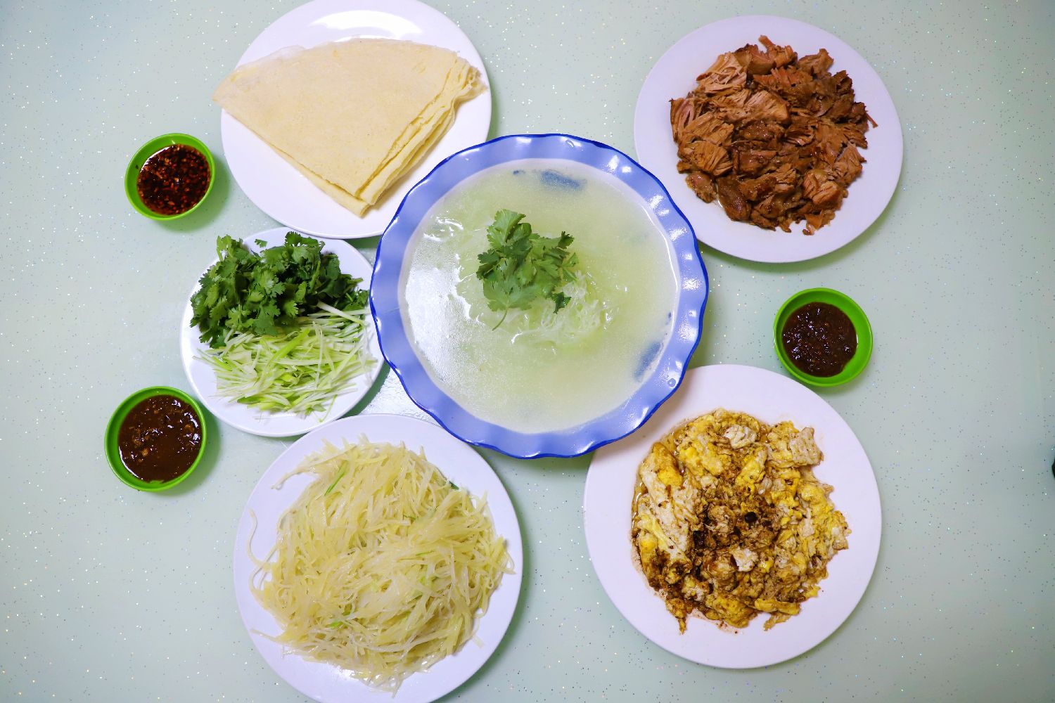 “我家煎饼以大米、小米、水、油等为主要原料,经过研磨、搅拌、静置、摊烙等步骤制作而成,再依据个人口味卷上鸡蛋酱、土豆丝、拆骨肉、小葱等配菜,配上一碗爽滑顺气的萝卜汤。”说起制作过程,干了30多年的秦玉霞如数家珍。