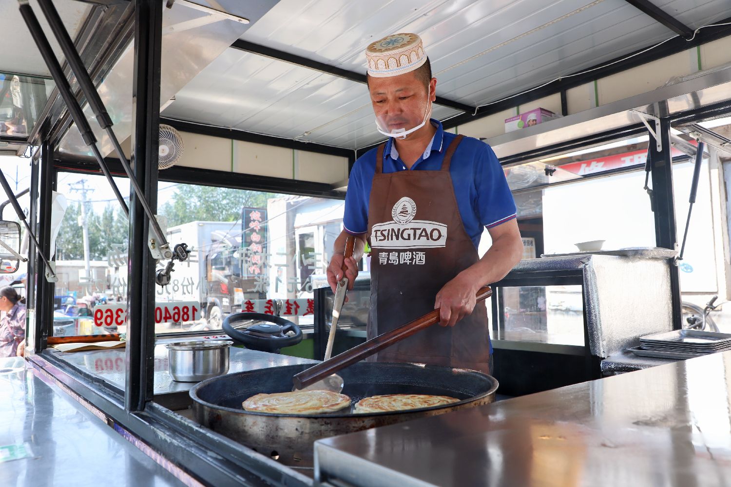 6月4日,王建军一早出摊,烙制“王小二大饼”。