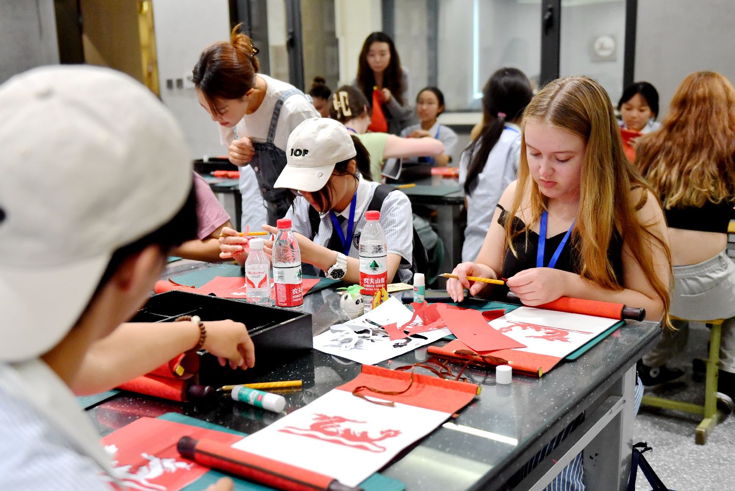 6月8日,研学团成员和中国学生展示龙舟剪纸。