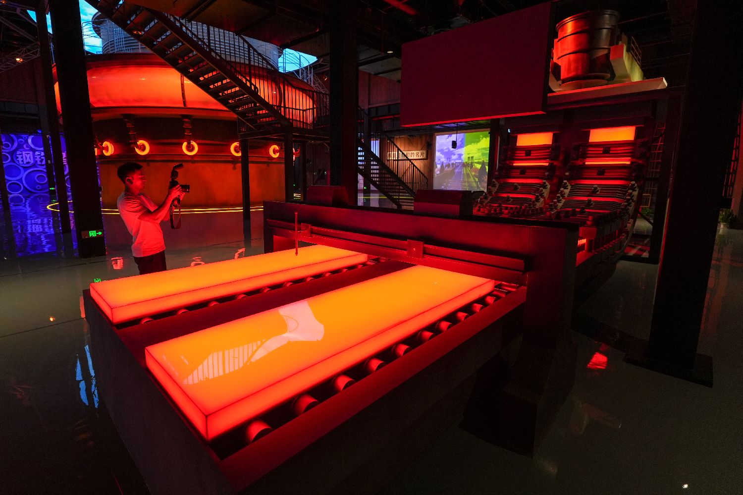 游客在南京市雨花台区梅钢工业文化旅游区钢铁体验馆内参观拍照(6月12日摄)。