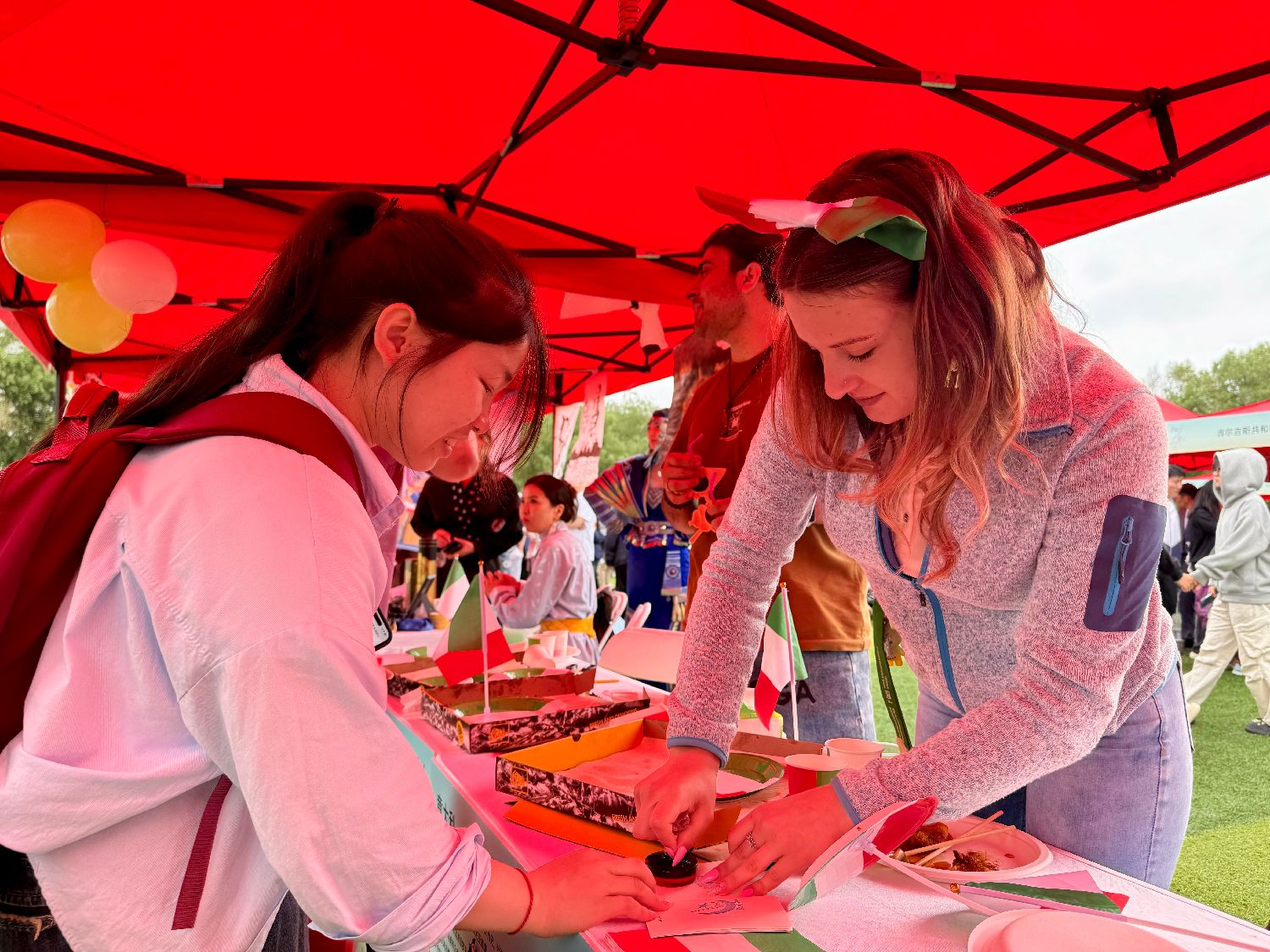 6月15日,在东北林业大学第九届国际文化节上,意大利留学生为中国学生盖上“打卡”纪念章。(图片来源:本文图片均据新华社)