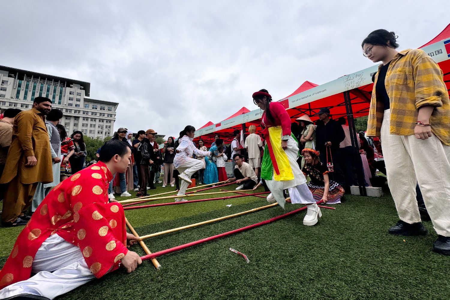6月15日,在东北林业大学第九届国际文化节上,参观者体验越南竹竿舞。