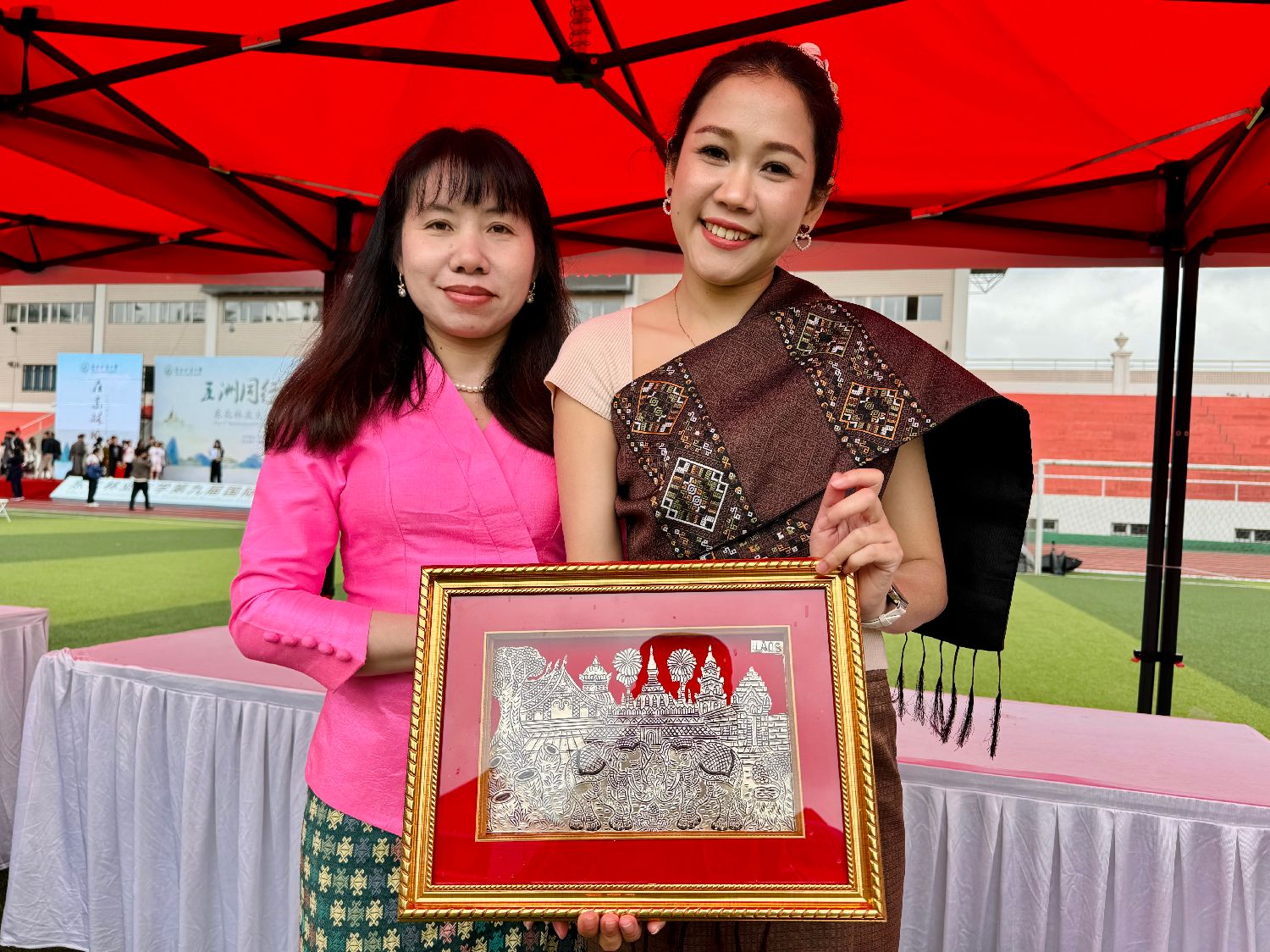 6月15日,在东北林业大学第九届国际文化节上,来自老挝的留学生展示手工艺品。