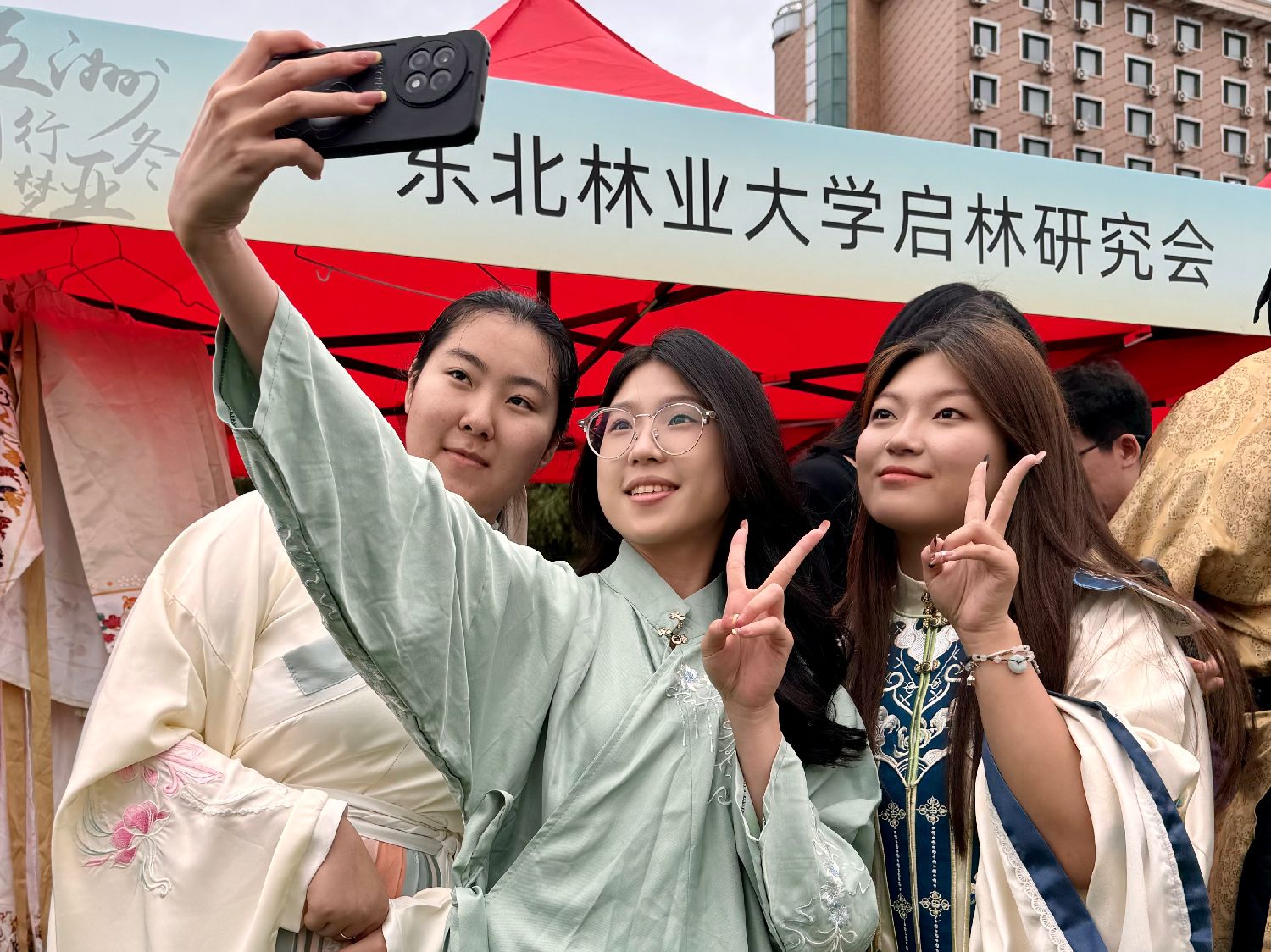 6月15日,在东北林业大学第九届国际文化节上,身穿中国传统服饰的马来西亚留学生余恺倪(中)与中国学生自拍。