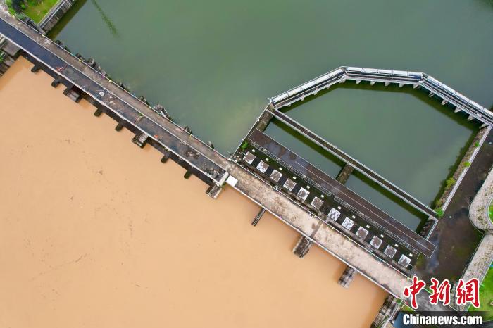 6月18日,福建福州,闽江上黄色洪水与内河水形成鲜明对比。