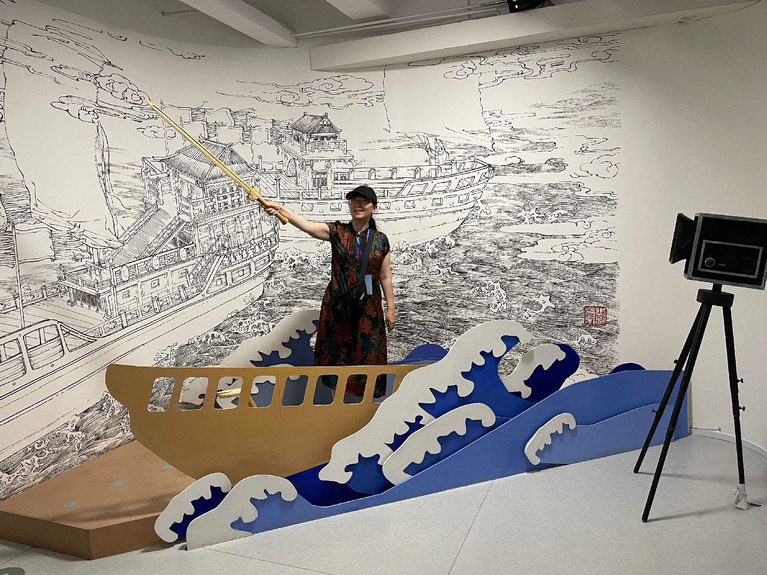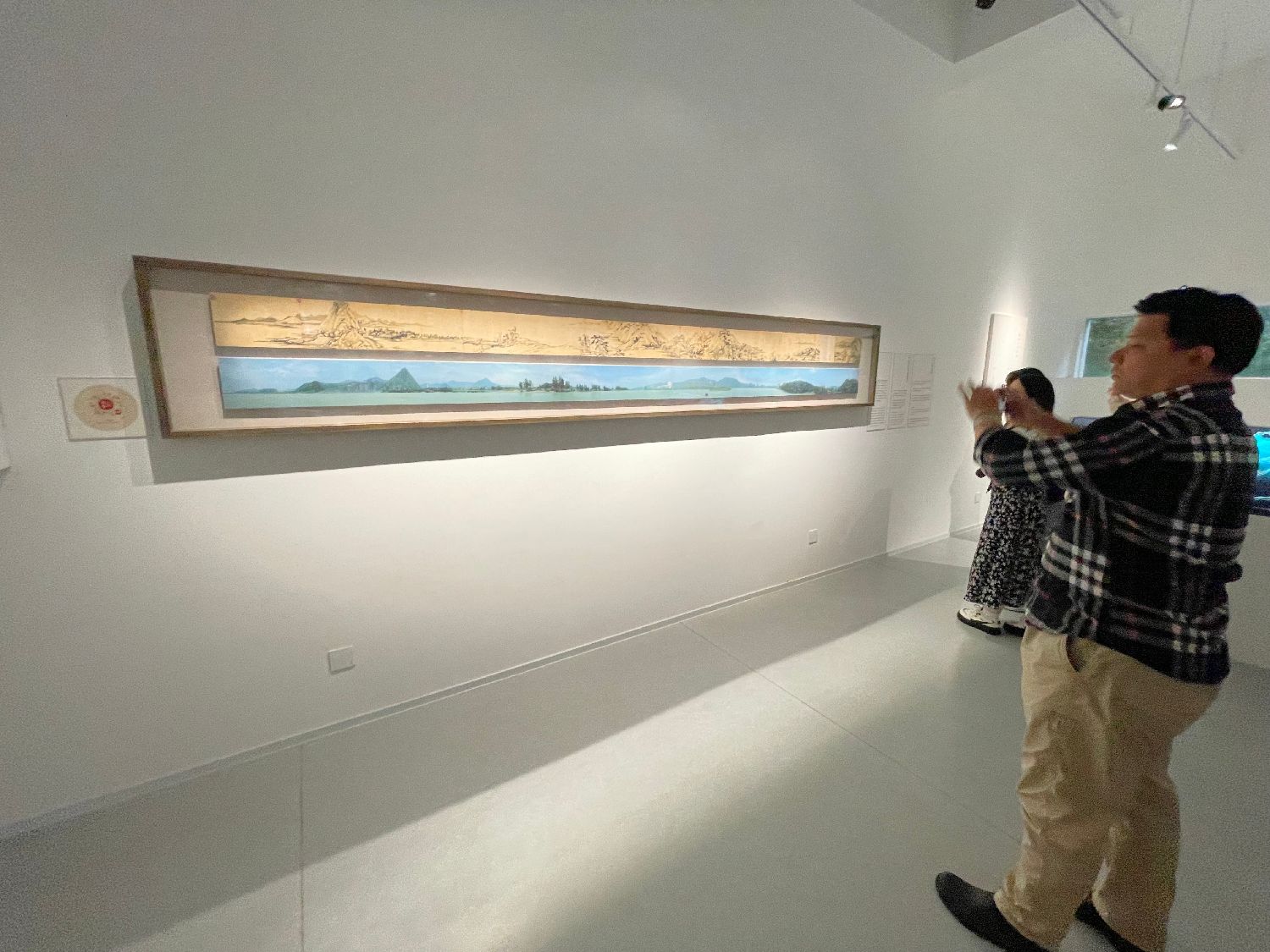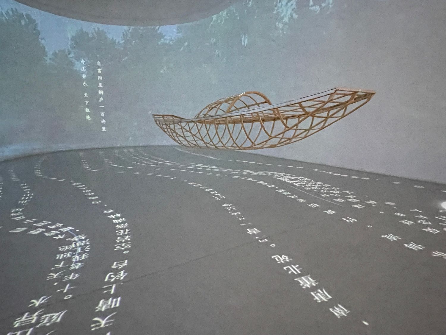 除了通过馆藏文物讲述黄公望和他的富春山居图,为了吸引更多年轻人关注,富阳区还特别打造了富春山居·数字诗路文化体验馆,借助新质生产力,让古老的故事变得更加新潮。图为体验馆运用文字、影像以及VR/AR、3D全息投影等手段,打造了地面上流淌富春江诗歌,扫码即可在手机上看到江上游船的场景。