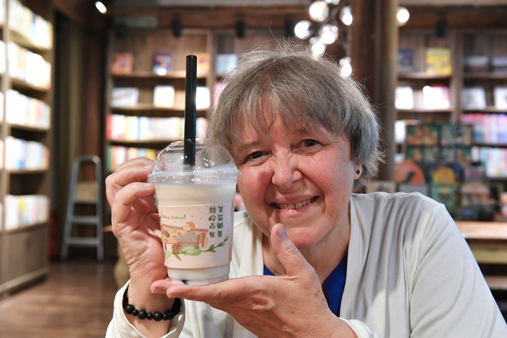 6月21日,美国穆蔼仁家族后人、鼓岭旅游文化研究会高级顾问兼首席研究员穆言灵在福州鼓岭大梦书屋休憩时,品尝并展示该店新推出的茉莉花奶茶。(图片来源:中新社)