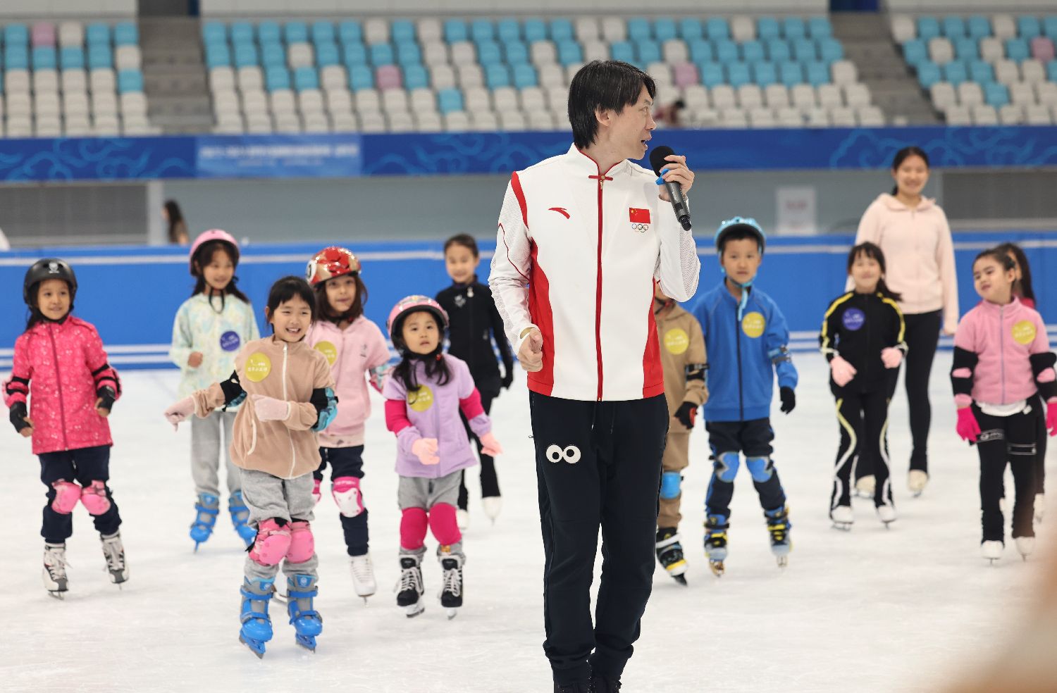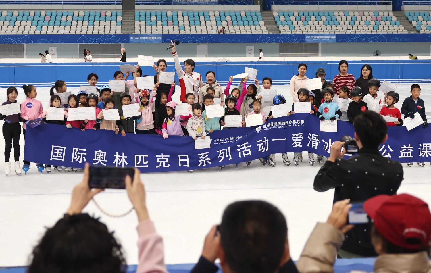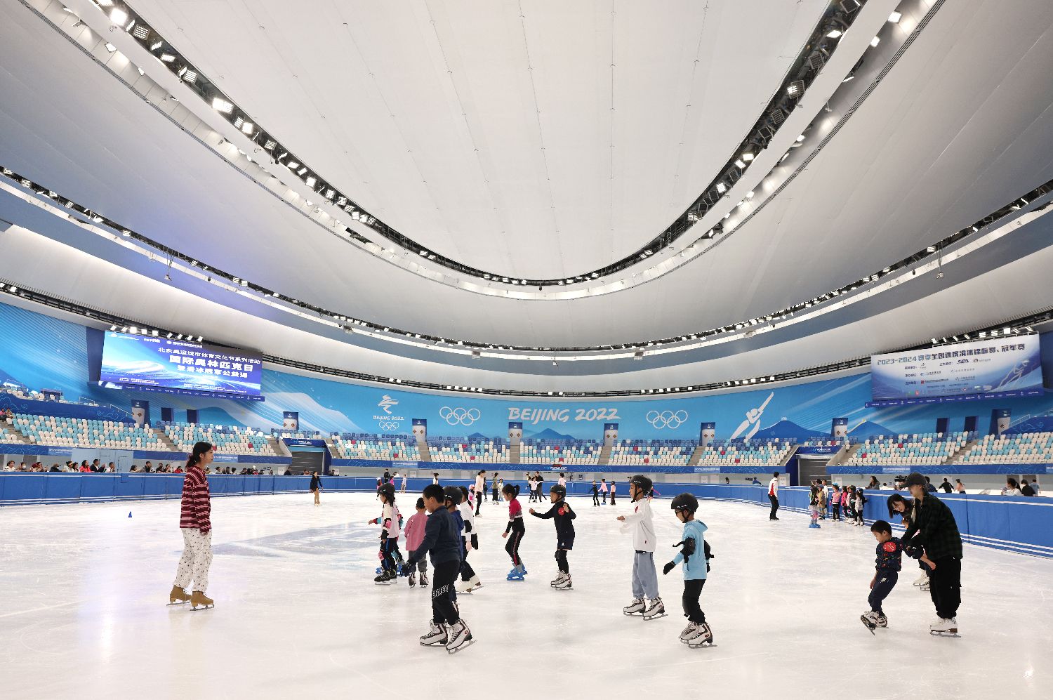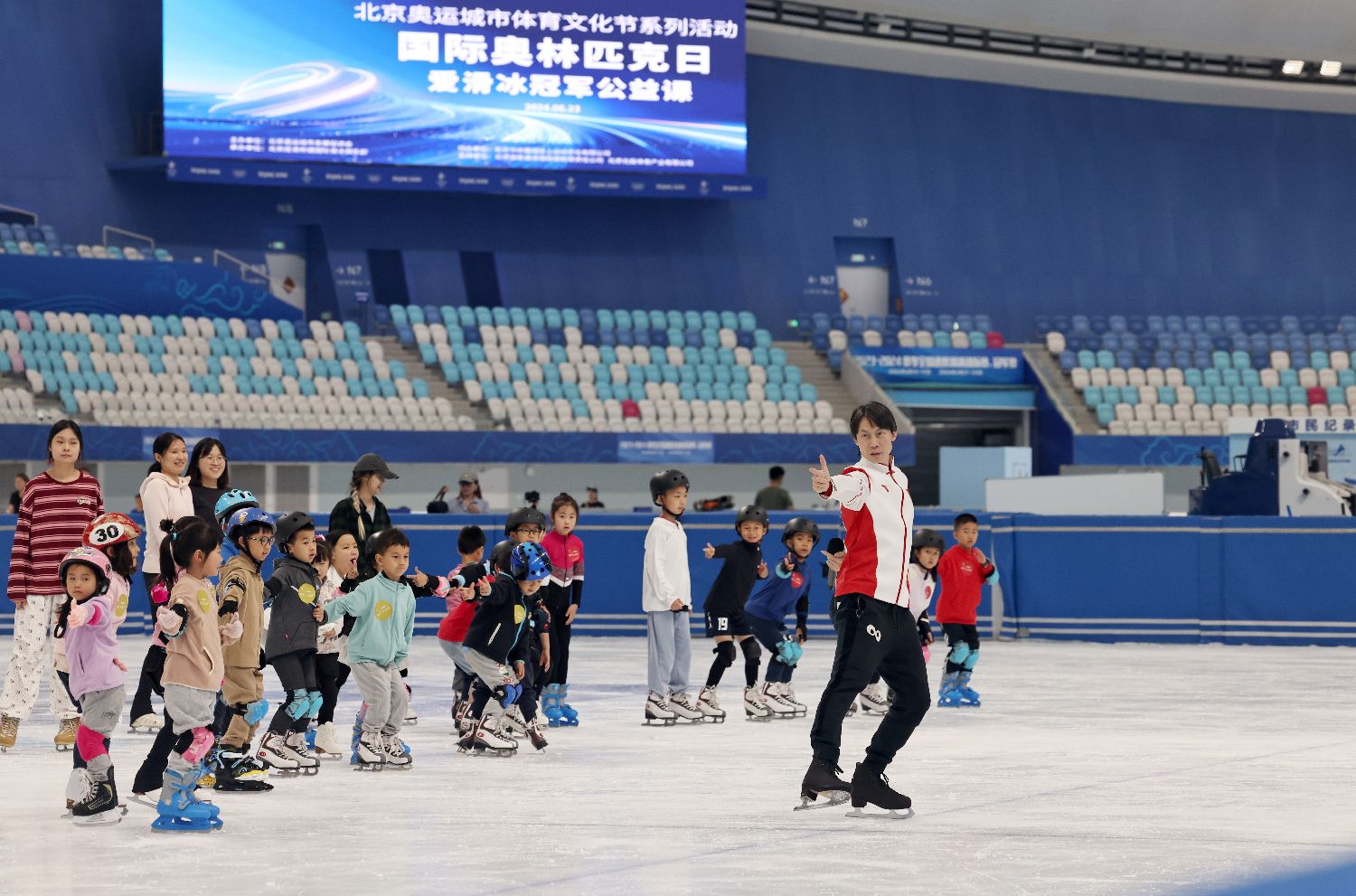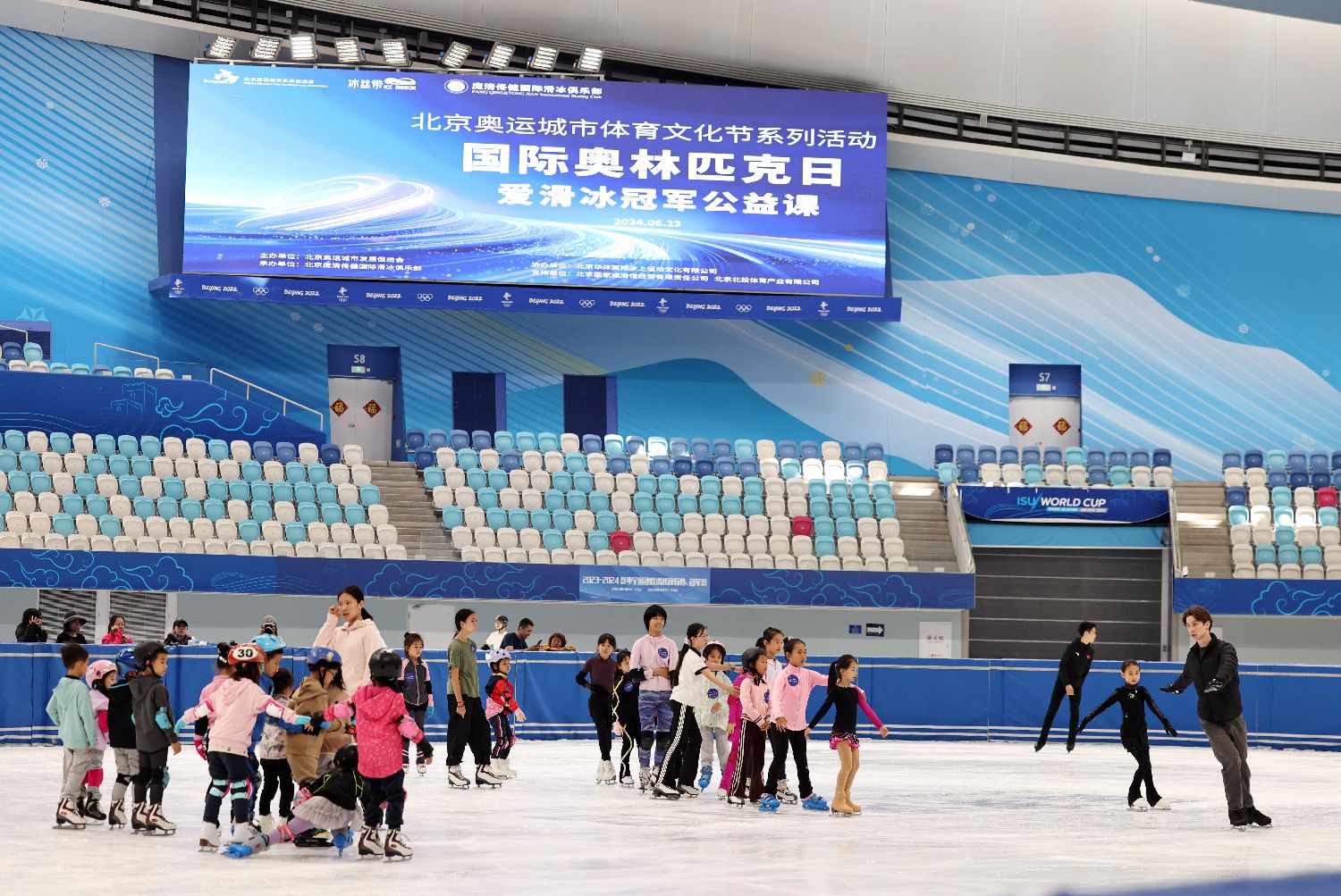 2024年6月23日是国际奥林匹克日,“爱滑冰冠军公益课”活动在北京国家速滑馆(冰丝带)、庞清佟健冰上艺术中心及潞城全民健身中心滑冰馆同步举办。
