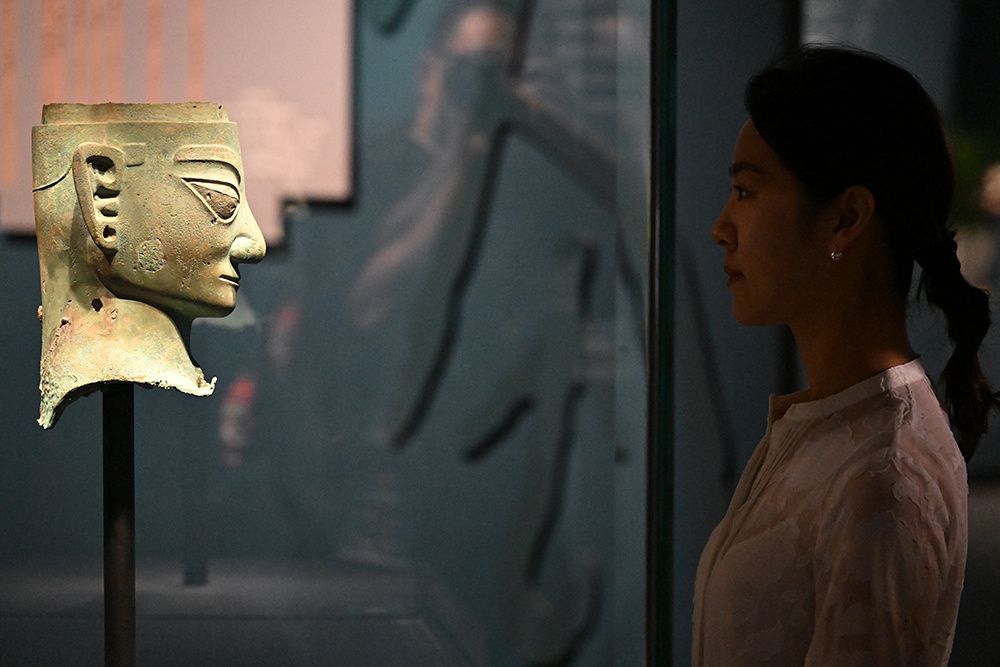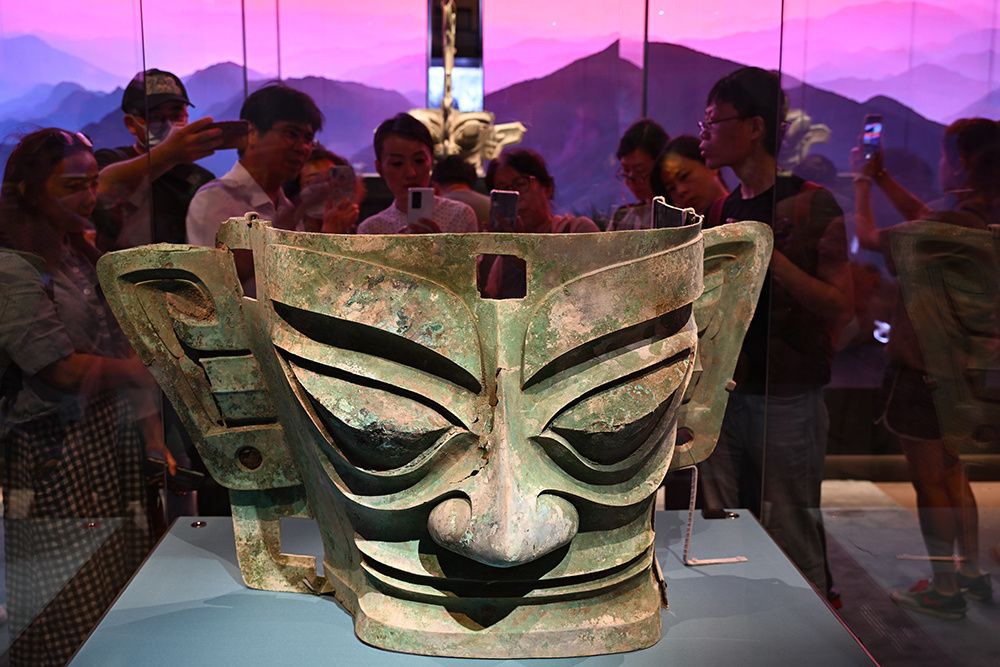 中新社记者从首都博物馆获悉,本次展览的展品来自故宫博物院、四川省文物考古研究院、成都金沙遗址博物馆等12家博物馆及文博机构。展品极具古蜀文明特点,雄伟的青铜大立人像、充满神秘色彩的戴冠纵目青铜面具、璀璨夺目的金面具青铜人头像等齐聚大运河畔,展现中华文明的灿烂辉煌。