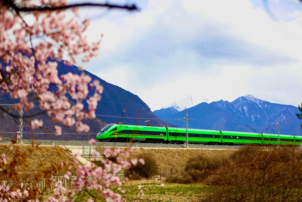 2024年4月,拉林铁路沿线桃花盛开。(图片来源:中新社)