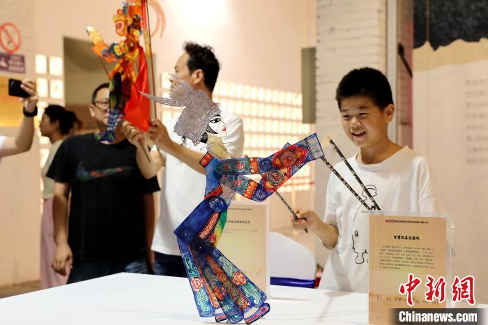 图为一位小观众(右)在皮影艺术作品展示现场体验。