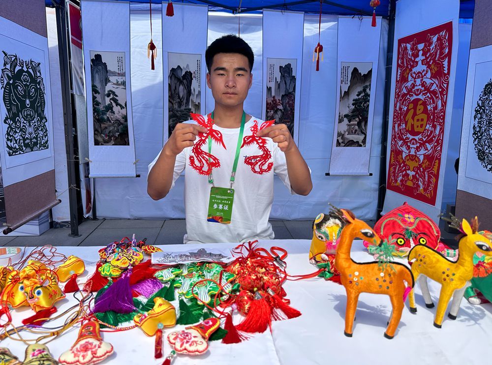 7月14日,甘肃省庆城职业中等专业学校学生张岩展示其剪纸作品。(图片来源:中新社)