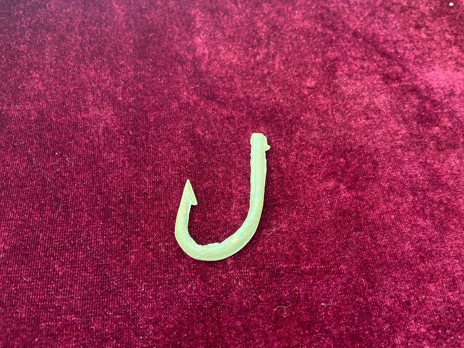 青铜色的鱼钩钩柄较大,呈弯弧形,内有倒刺,钩体两侧存在范铸法留下的范缝,长4.2厘米,宽2.5厘米,依稀可见其锋利的钩尖……