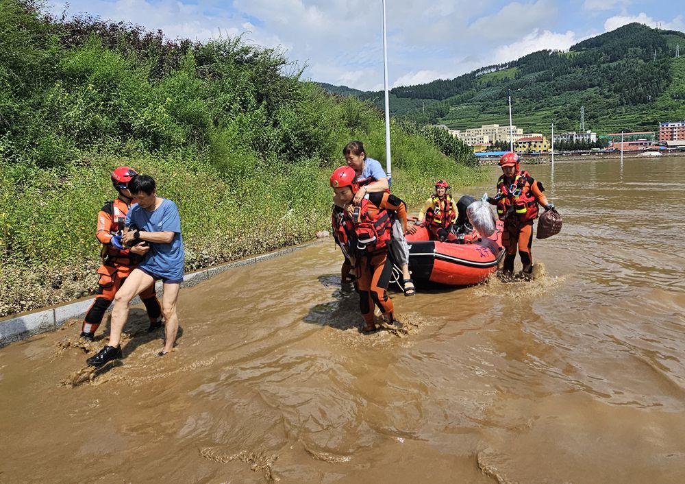 7月28日,吉林临江,消防人员转移受困民众。(图片来源:白山市官方供图)