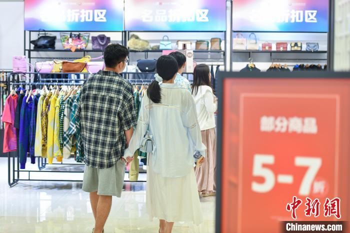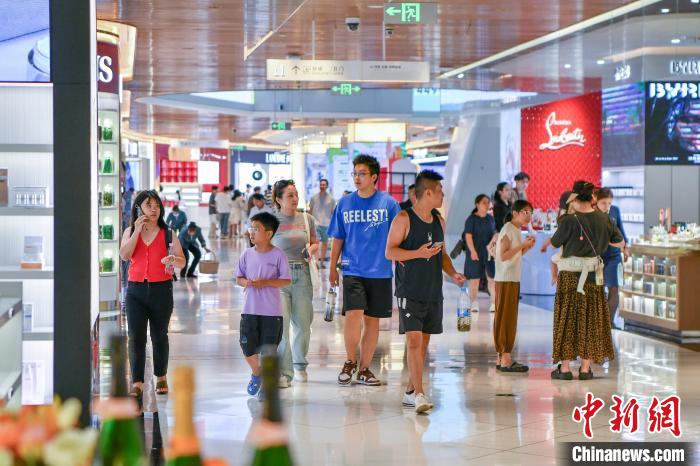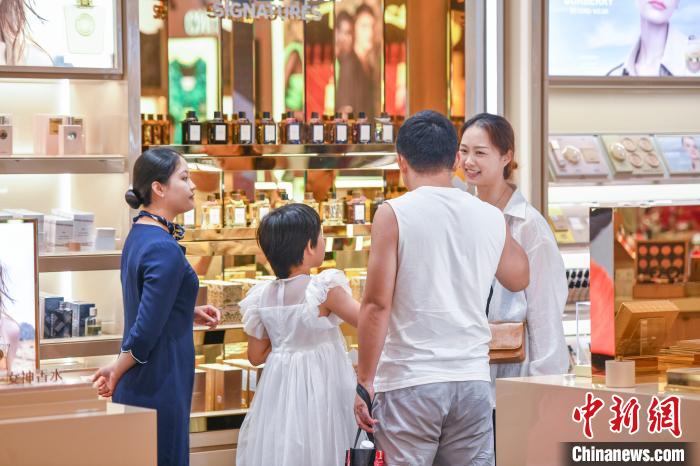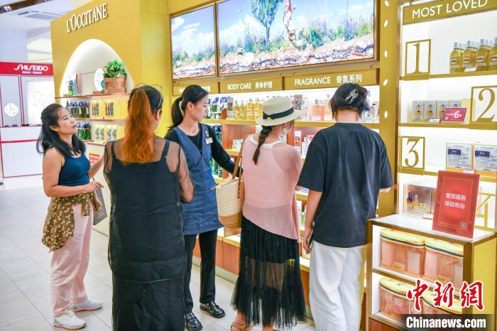 图为8月4日,顾客在海控全球精品免税城选购商品。(图片来源:本文图片均据中新网)