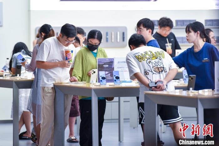 图为8月4日,顾客在海控全球精品免税城选购电子产品。