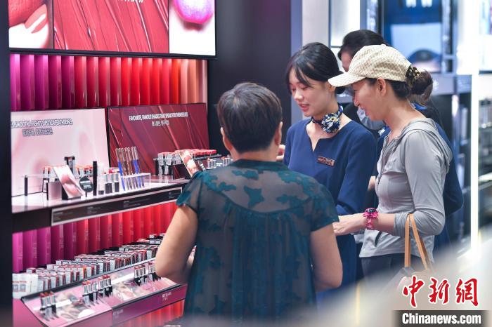 图为8月4日,顾客在海控全球精品免税城选购化妆品。