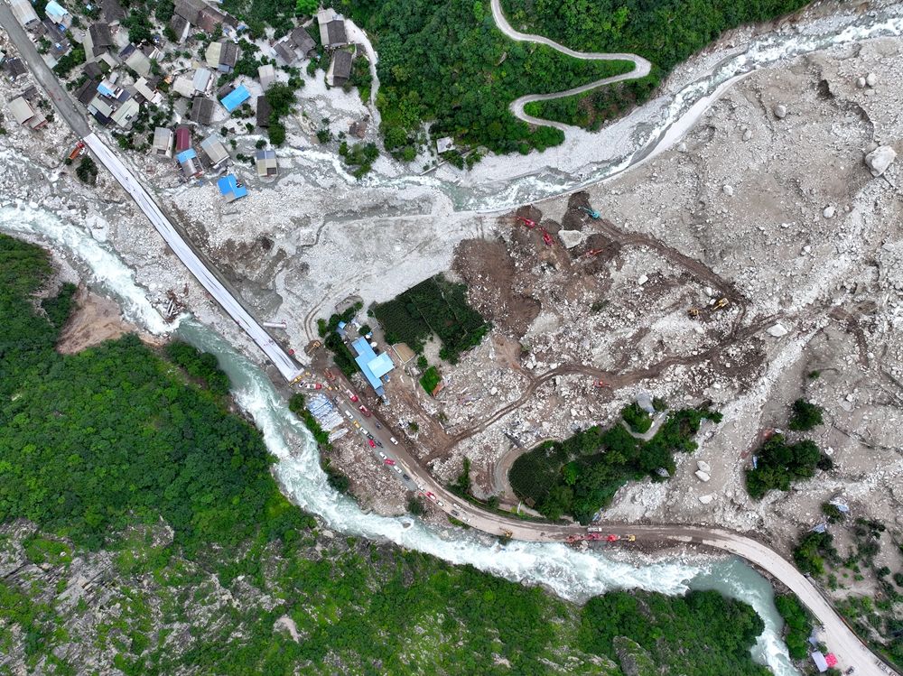 8月6日,康定山洪泥石流灾害现场,318国道受灾段已抢通。(图片来源:中新社)