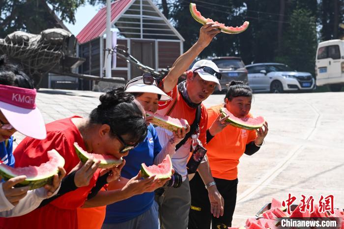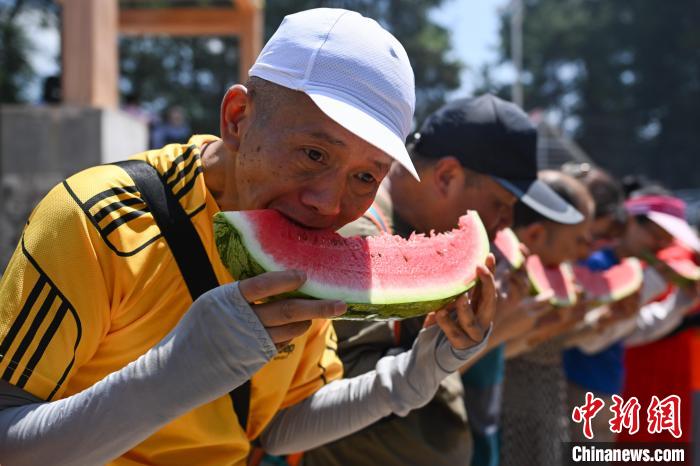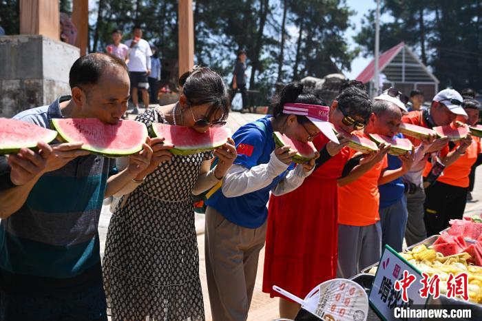 图为8月7日,游客在重庆美心红酒小镇进行“啃秋”吃西瓜比赛。(图片来源:本文图片均据中新网)