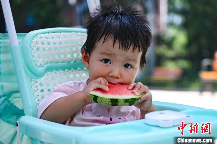 图为8月7日,重庆美心红酒小镇,一位小朋友在吃西瓜“啃秋”。
