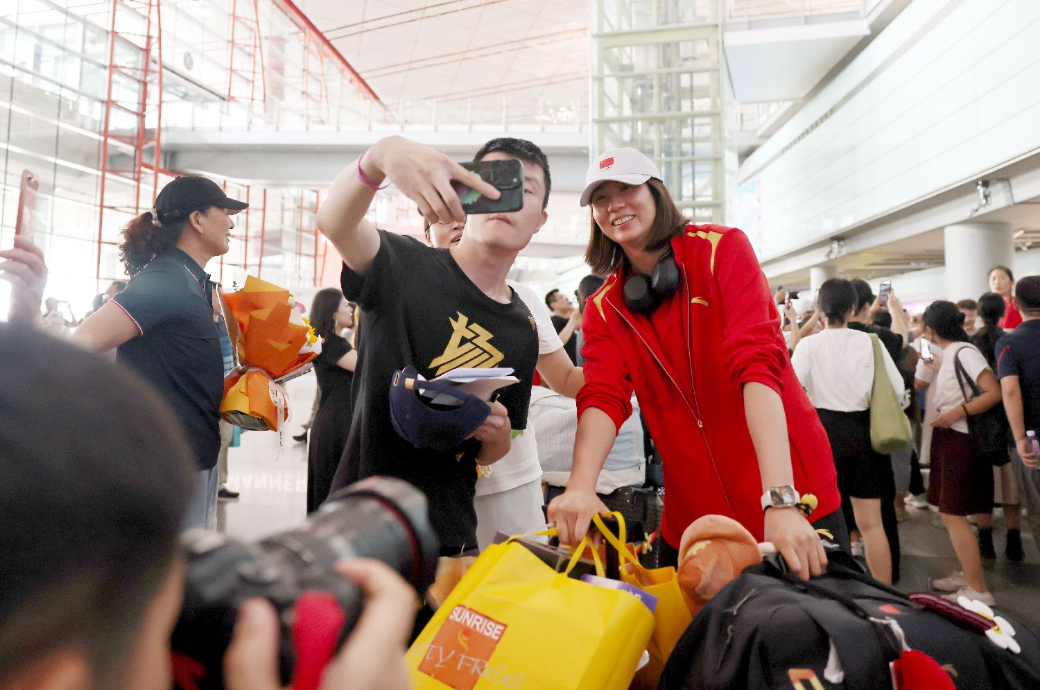 北京时间2024年8月8日,中国女子排球运动员与在北京首都国际机场T3航站楼接机的球迷合影。