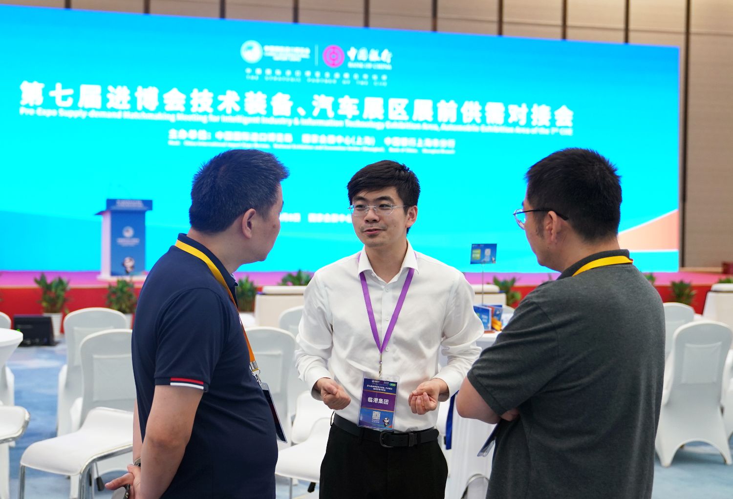8月8日,展商工作人员(左、右)与采购商(中)在对接会场内交流讨论。