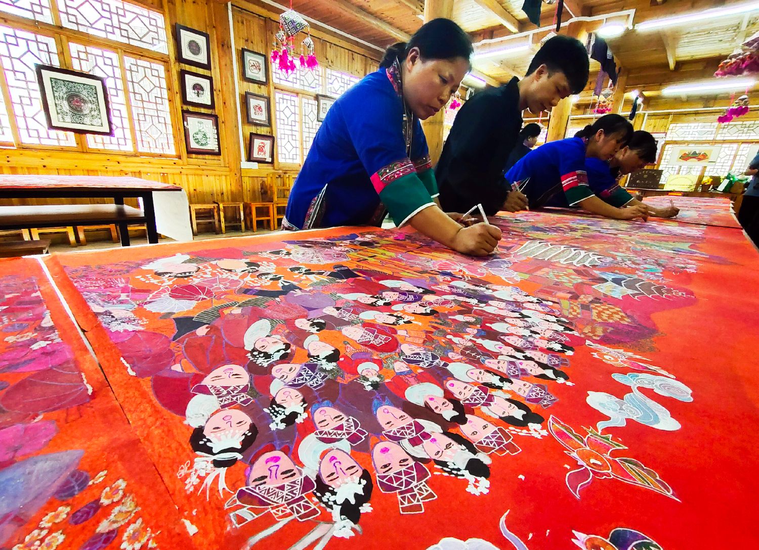 近日,在广西三江侗族自治县民族实验学校农民画工作坊,当地农民画家正在集体创作农民画长卷作品。(图片来源:中新社)
